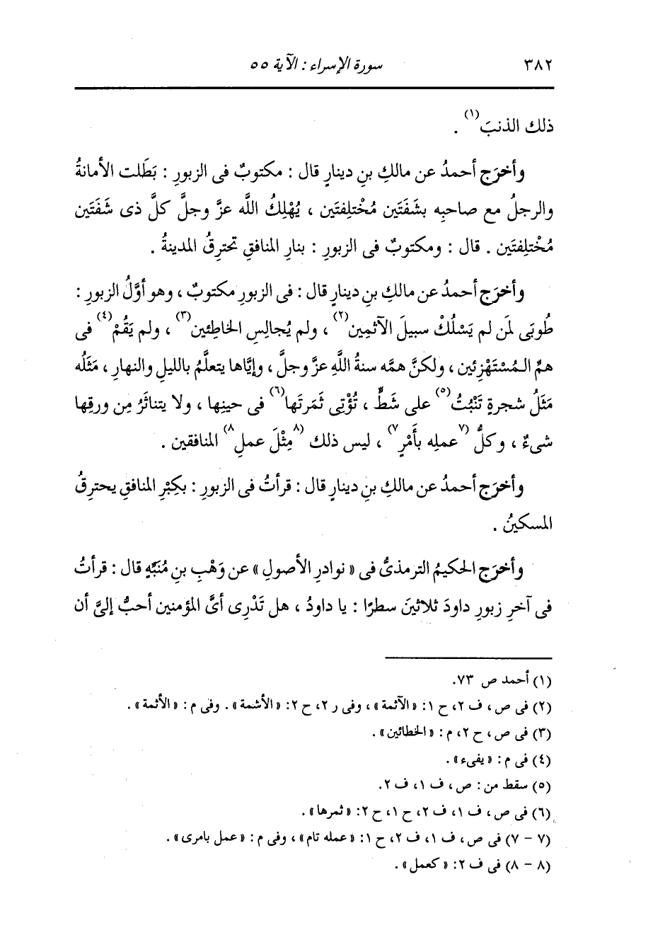 وأخرج أحمد عن مالك بن دينار رضي الله عنه قال : مكتوب في الزبور بطلت الأمانة والرجل مع صاحبه بشفتين مختلفتين يهلك الله عز وجل كل ذي شفين مختلفتين ، قال : ومكتوب في الزبور بنار المنافق تحترق المدينة.