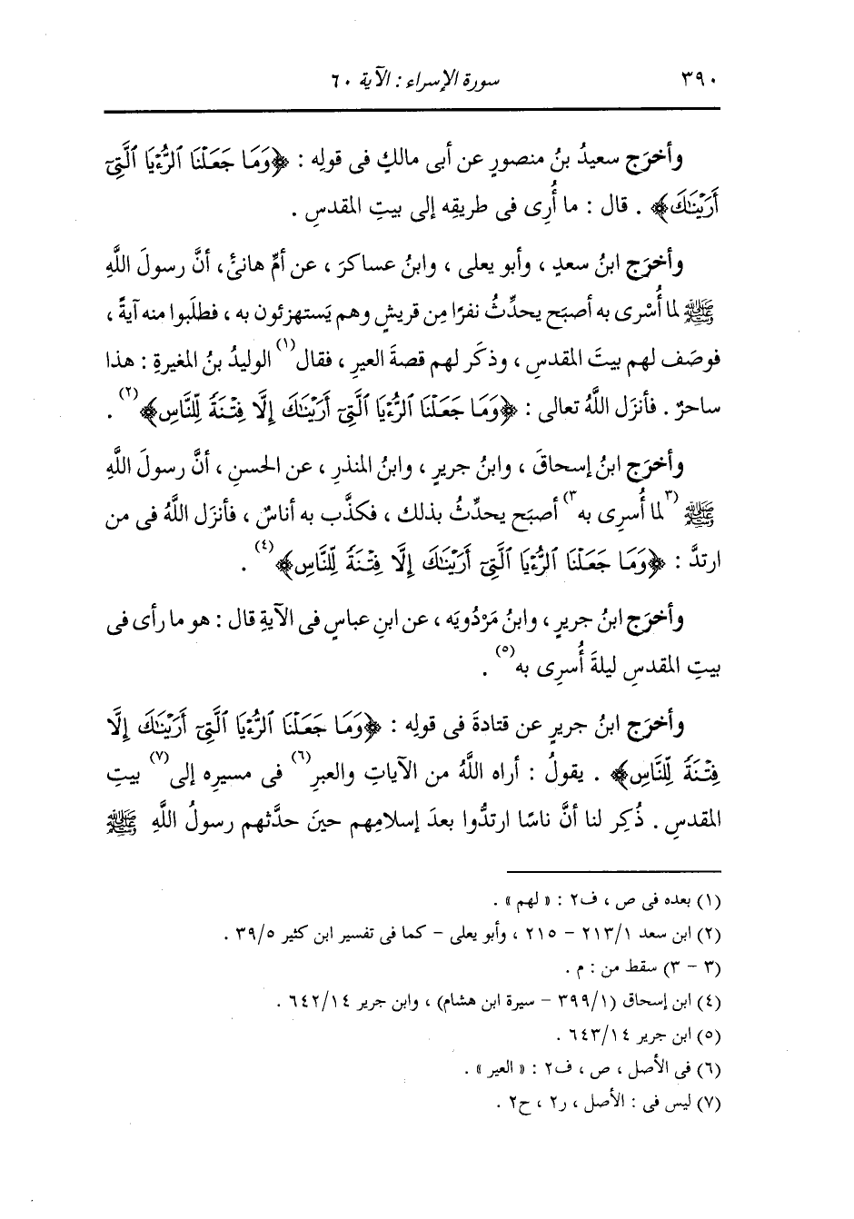 وأخرج ابن إسحاق ، وَابن جَرِير ، وَابن المنذر عن الحسن رضي الله عنه أن رسول الله صلى الله عليه وسلم أصبح يحدث بذلك فكذب به أناس فأنزل الله فيمن ارتد : {وما جعلنا الرؤيا التي أريناك إلا فتنة للناس}.