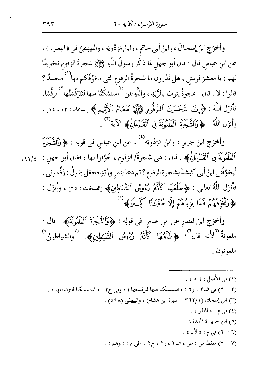 وأخرج ابن جرير ، وَابن المنذر عن ابن عباس رضي الله عنهما في قوله : {والشجرة الملعونة في القرآن} قال : هي شجرة الزقوم خوفوا بها ، قال أبو جهل : أيخوفني ابن أبي كبشة بشجرة الزقوم ثم دعا بتمر وزبد فجعل يقول : زقموني ، فأنزل الله تعالى : (طلعها كأنه رؤوس الشياطين) (الصافات آية 65) وأنزل الله {ونخوفهم فما يزيدهم إلا طغيانا كبيرا}.