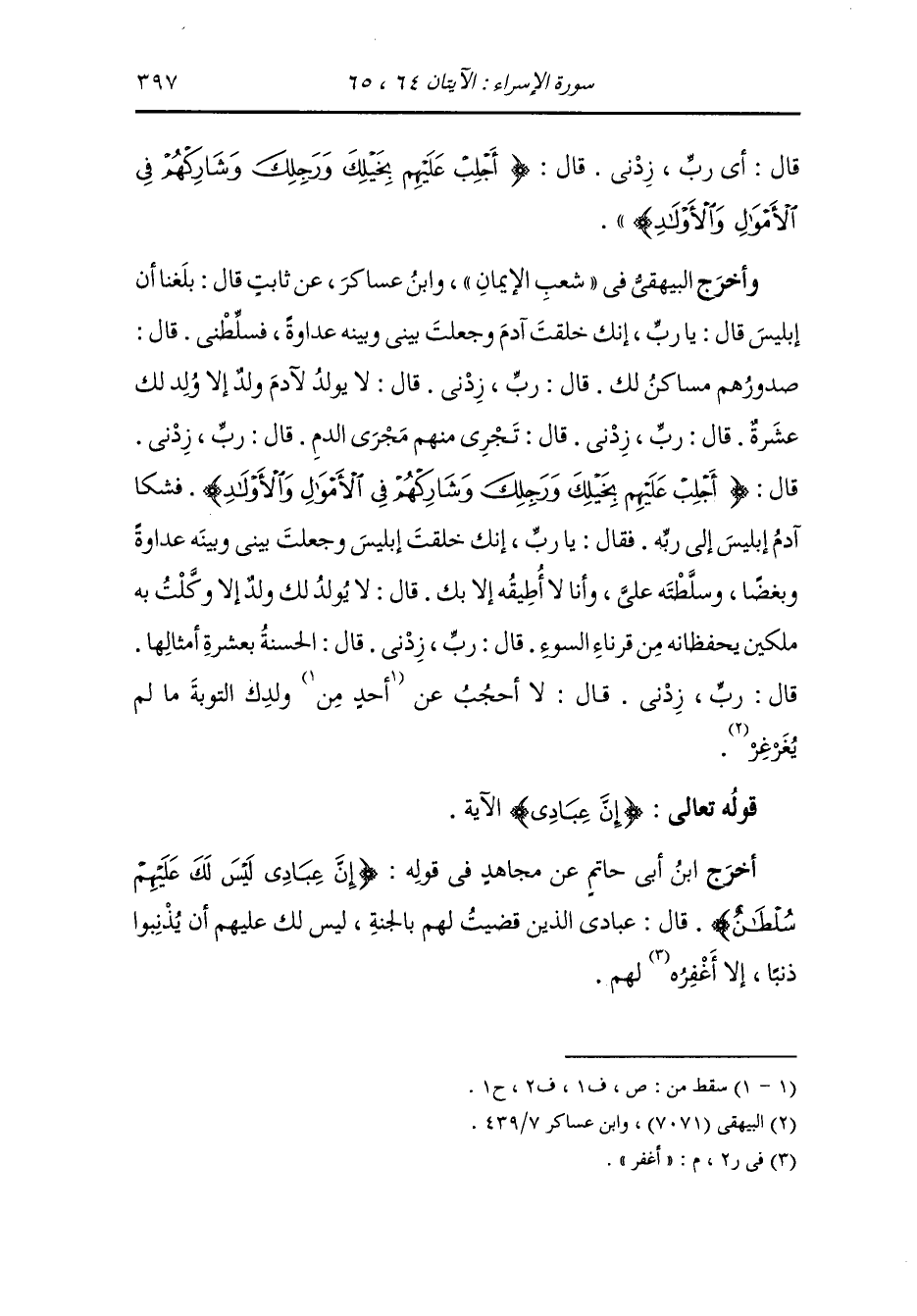 وأخرج البيهقي في شعب الإيمان ، وَابن عساكر عن ثابت رضي الله عنه قال : بلغنا أن إبليس قال : يا رب إنك خلقت آدم وجعلت بيني وبينه عداوة فسلطني قال : صدورهم مساكن لك ، قال : رب زدني ، قال : لا يولد لآدم ولد إلا ولد لك عشرة ، قال : رب زدني ، قال : تجري منهم مجرى الدم ، قال : رب زدني ، قال : {وأجلب عليهم بخيلك ورجلك وشاركهم في الأموال والأولاد} فشكا آدم - عليه السلام - إبليس إلى ربه ، قال : يا رب إنك خلقت إبليس وجعلت بيني وبينه عداوة وبغضا وسلطته علي وأنا لا أطيقه إلا بك ، قال : لا يولد لك ولد إلا وكلت به ملكين يحفظانه من قرناء السوء ، قال : رب زدني ، قال : الحسنة بعشرة أمثالها قال : رب زدني ، قال : لا أحجب عن أحد من ولدك التوبة ما لم يغرغر ، والله أعلم.