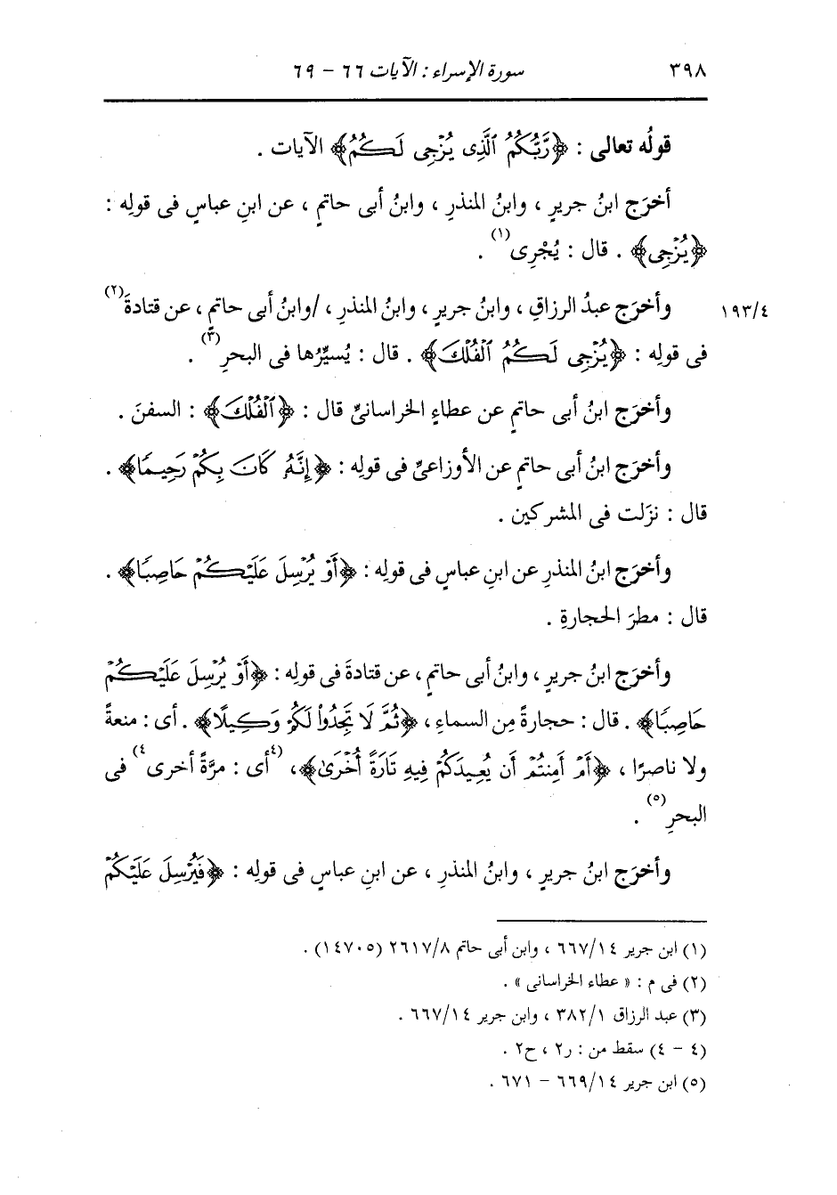 وأخرج ابن جرير ، وَابن أبي حاتم عن قتادة رضي الله عنهما في قوله : {أو يرسل عليكم حاصبا} قال : حجارة من السماء {ثم لا تجدوا لكم وكيلا} أي منعة ولا ناصرا {أم أمنتم أن يعيدكم فيه تارة أخرى} أي مرة أخرى في البحر.