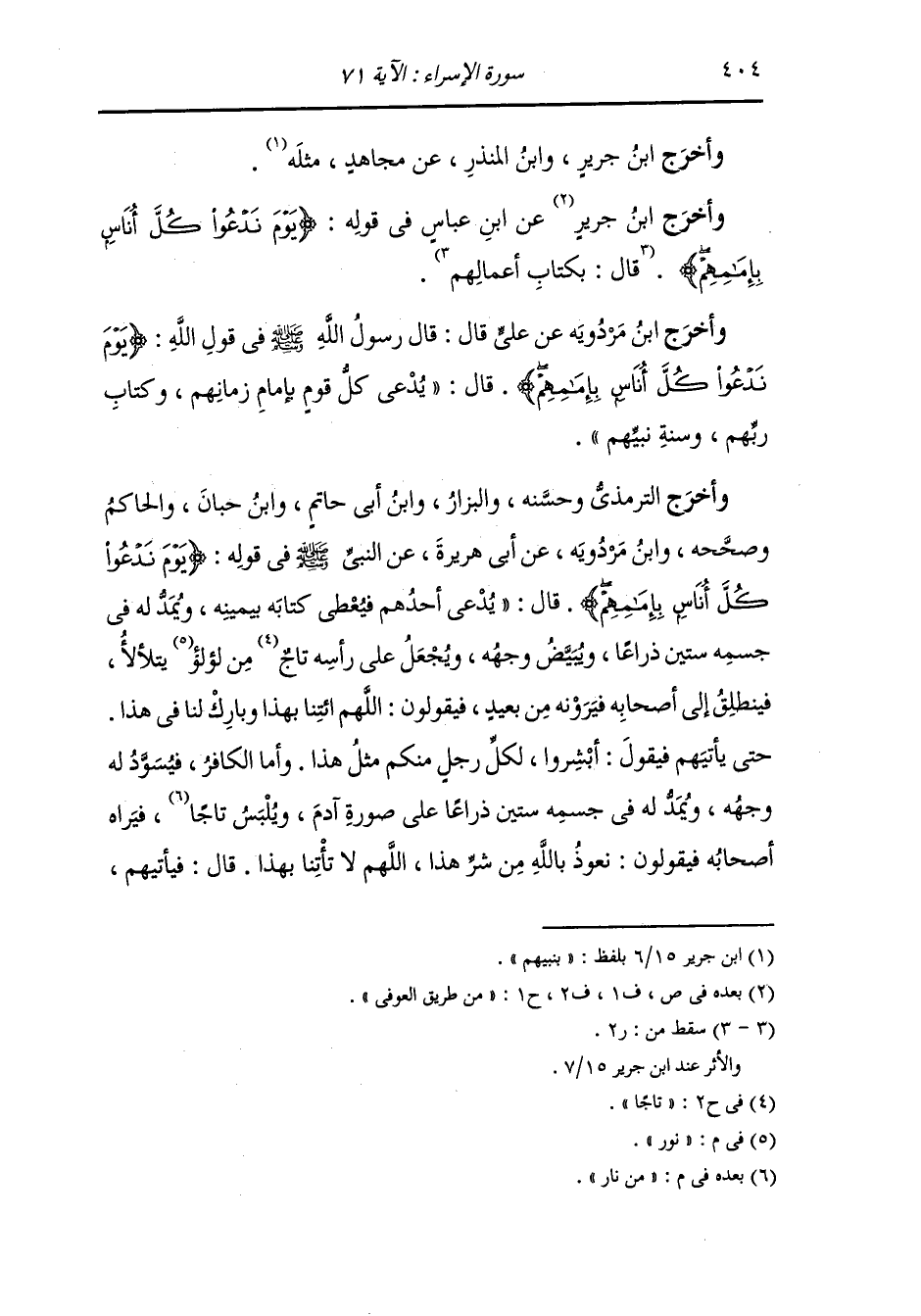 وأخرج الترمذي وحسنه والبزار ، وَابن أبي حاتم ، وَابن حبان والحاكم وصححه ، وَابن مردويه عن أبي هريرة رضي الله عنه عن رسول الله صلى الله عليه وسلم في قوله : {يوم ندعوا كل أناس بإمامهم} قال : يدعى أحدهم فيعطى كتابه بيمينه ويمد له في جسمه ستين ذراعا ويبيض وجهه ويجعل على رأسه تاج من نور يتلألأ فينطلق إلى أصحابه فيرونه من بعيد فيقولون : اللهم ائتنا بهذا وبارك لنا في هذا حتى يأتيهم فيقول : أبشروا ، لكل رجل منكم مثل هذا.