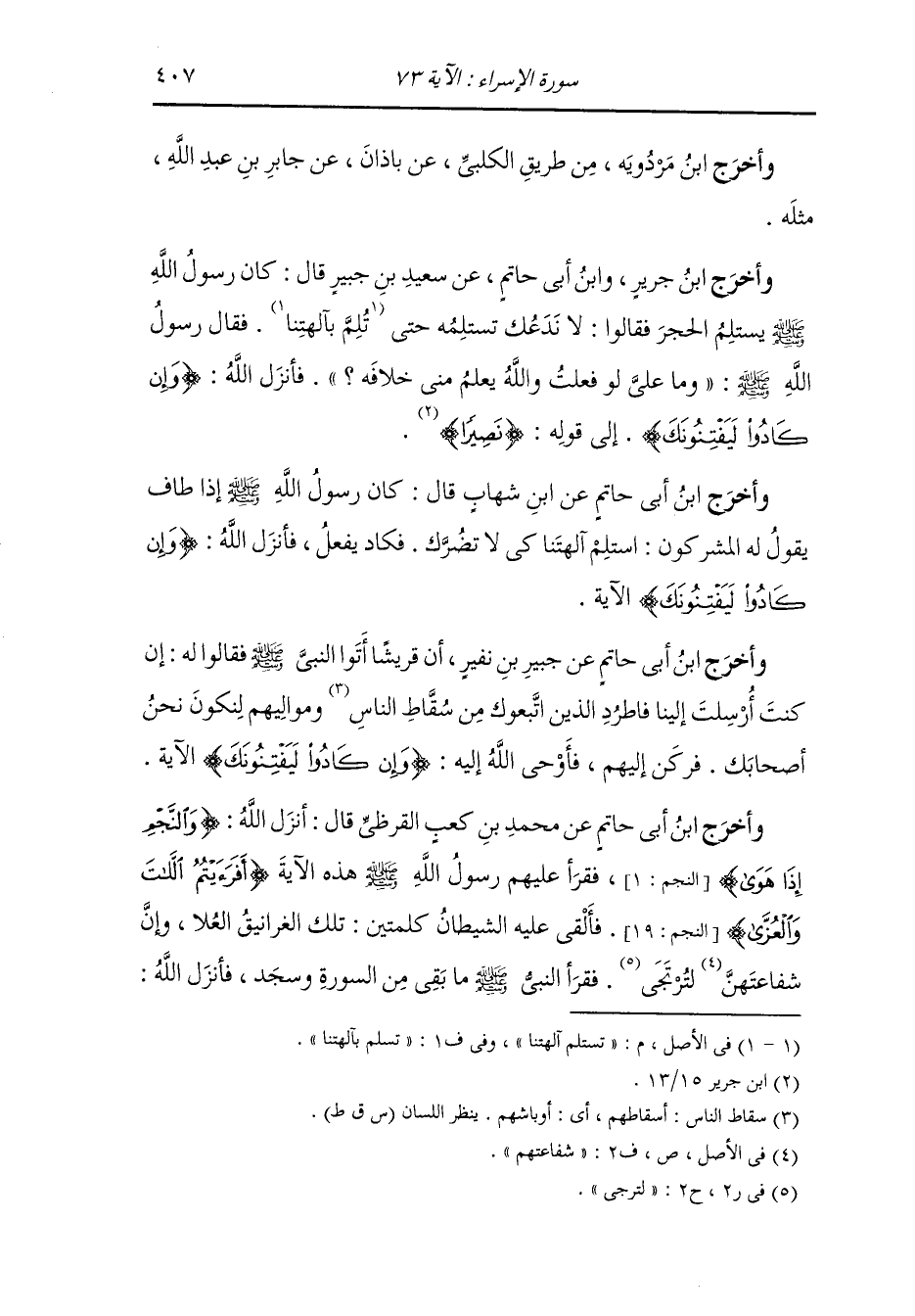 وأخرج ابن أبي حاتم عن ابن شهاب قال : كان رسول الله صلى الله عليه وسلم إذا طاف يقول له المشركون : استلم آلهتنا كي لا تضرك فكاد يفعل فأنزل الله {وإن كادوا ليفتنونك} الآية.
