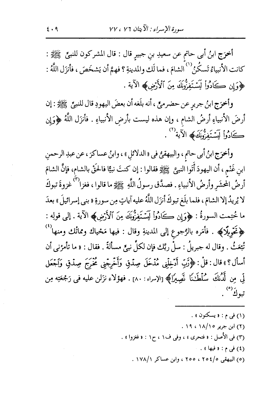 وأخرج ابن أبي حاتم والبيهقي في الدلائل ، وَابن عساكر عن عبد الرحمن بن غنم رضي الله عنه : أن اليهود أتوا النَّبِيّ صلى الله عليه وسلم فقالوا : إن كنت نبيا فالحق بالشام فإن الشام أرض المحشر وأرض الأنبياء عليهم الصلاة والسلام ، فصدق رسول الله صلى الله عليه وسلم ما قالوا فغزا تبوك لا يريد إلا الشام فلما بلغ تبوك أنزل الله عليه آيات من سورة بني إسرائيل بعد ما ختمت السورة {وإن كادوا ليستفزونك من الأرض} الآية ، إلى قوله : {تحويلا} فأمره بالرجوع إلى المدينة وقال : فيها محياك وفيها مماتك وفيها تبعث ، وقال له جبريل عليه السلام : سل ربك ، فإن لكل نبي مسألة ، فقال : ما تأمرني أن أسأل قال : (قل رب أدخلني مدخل صدق وأخرجني مخرج صدق واجعل لي من لدنك سلطانا نصيرا) فهؤلاء نزلن عليه في رجعته من تبوك.