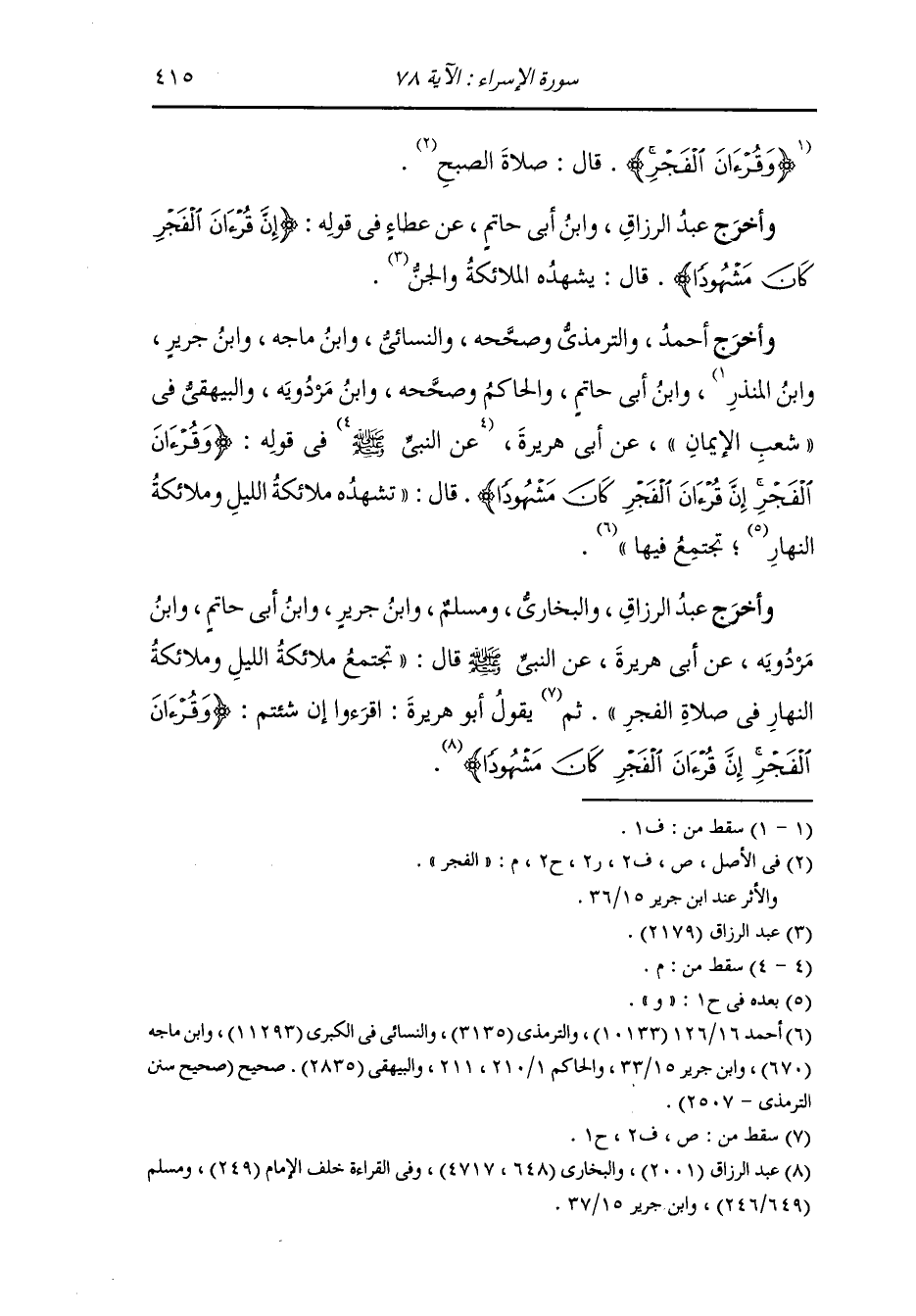 وأخرج أحمد والترمذي وصححه والنسائي ، وَابن ماجة ، وَابن جَرِير ، وَابن المنذر ، وَابن أبي حاتم والحاكم وصححه ، وَابن مردويه والبيهقي في شعب الإيمان عن أبي هريرة رضي الله عنه في قوله : {وقرآن الفجر إن قرآن الفجر كان مشهودا} قال : تشهده ملائكة الليل وملائكة النهار تجتمع فيها.