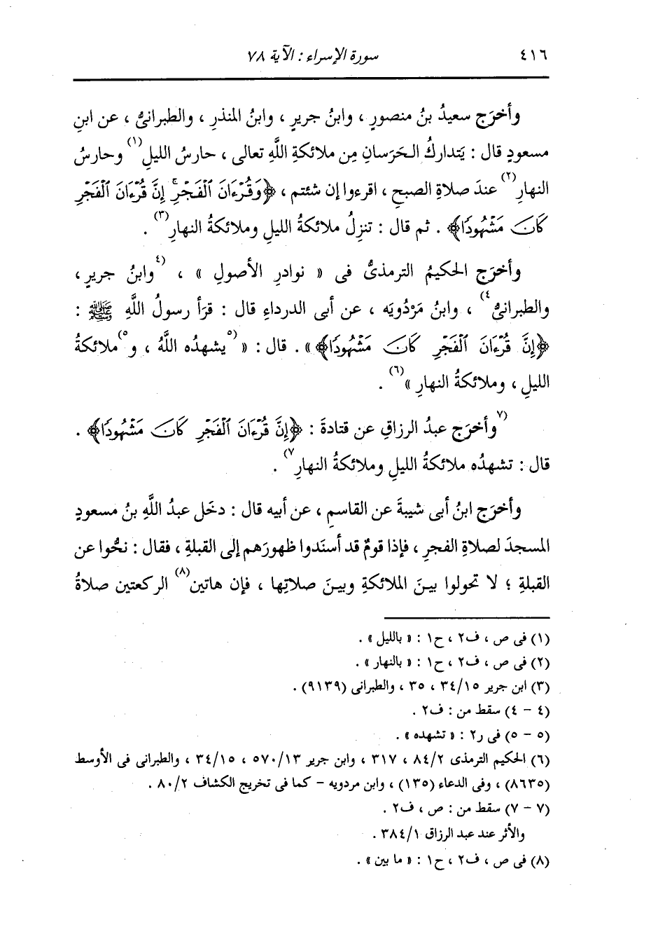 وأخرج سعيد بن منصور ، وَابن جَرِير ، وَابن المنذر والطبراني عن ابن مسعود رضي الله عنه قال : يتدارك الحرسان من ملائكة الله تعالى حارس الليل وحارس النهار عند صلاة الصبح اقرؤوا إن شئتم {وقرآن الفجر إن قرآن الفجر كان مشهودا} ثم قال : تنزل ملائكة الليل وملائكة النهار.