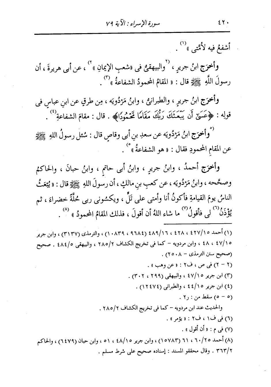 وأخرج أحمد ، وَابن جَرِير ، وَابن أبي حاتم ، وَابن حبان والحاكم وصححه ، وَابن مردويه عن كعب بن مالك رضي الله عنه أن رسول الله صلى الله عليه وسلم قال : يبعث الناس يوم القيامة فأكون أنا وأمتي على تل ويكسوني ربي حلة خضراء ثم يؤذن لي أن أقول ما شاء الله أن أقول فذلك المقام المحمود.