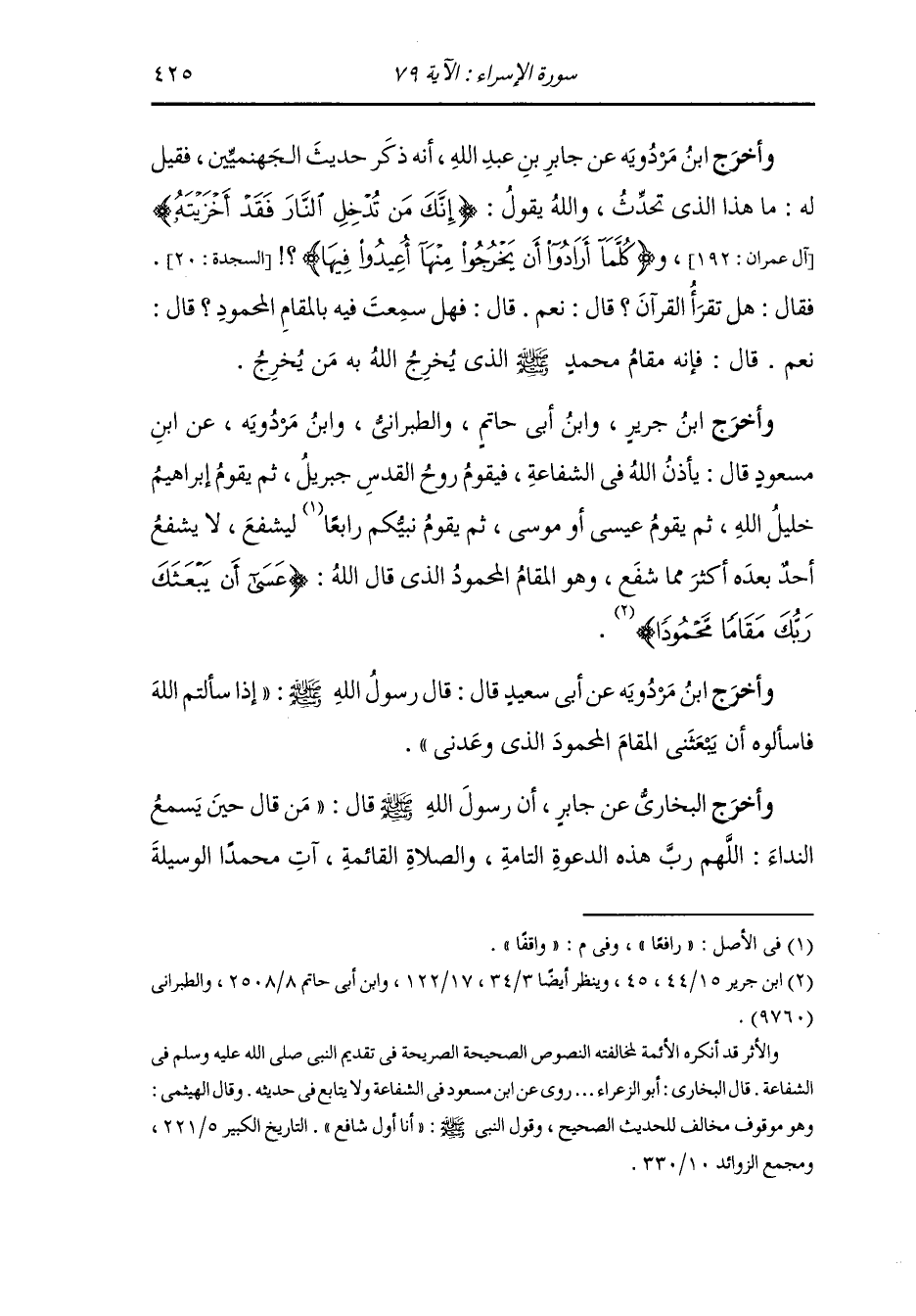 وأخرج ابن مردويه ، عَن جَابر بن عبد الله رضي الله عنه أنه ذكر حديث الجهنميين فقيل له : ما هذا الذي تحدث والله تعالى يقول : (إنك من تدخل النار فقد أخزيته) (آل عمران آية 192) (وكلما أرادوا أن يخرجوا منها أعيدوا فيها) (السجدة آية 20) فقال : هل تقرأ القرآن قال : نعم ، قال : فهل سمعت فيه بالمقام المحمود قال : نعم ، قال : فإنه مقام محمد صلى الله عليه وسلم الذي يخرج الله به من يخرج.