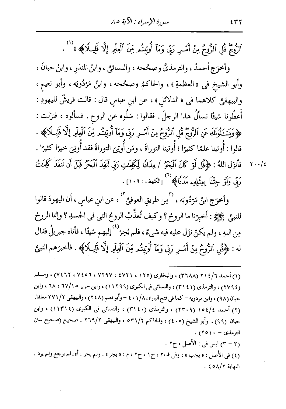 وأخرج أحمد والترمذي وصححه والنسائي ، وَابن المنذر ، وَابن حبان وأبو الشيخ في العظمة والحاكم وصححه ، وَابن مردويه وأبو نعيم والبيهقي كلاهما في الدلائل عن ابن عباس رضي الله عنهما قال : قالت قريش لليهود : أعطونا شيئا نسأل هذا الرجل فقالوا : سلوه عن الروح فسألوه فنزلت {ويسألونك عن الروح قل الروح من أمر ربي وما أوتيتم من العلم إلا قليلا} قالوا : أوتينا علما كثيرا : أوتينا التوراة ومن أوتي التوراة فقد أوتي خيرا كثيرا ، فأنزل الله تعالى (قل لو كان البحر مدادا لكلمات ربي لنفد البحر قبل أن تنفد كلمات ربي ولو جئنا بمثله مددا) (الكهف آية 109).