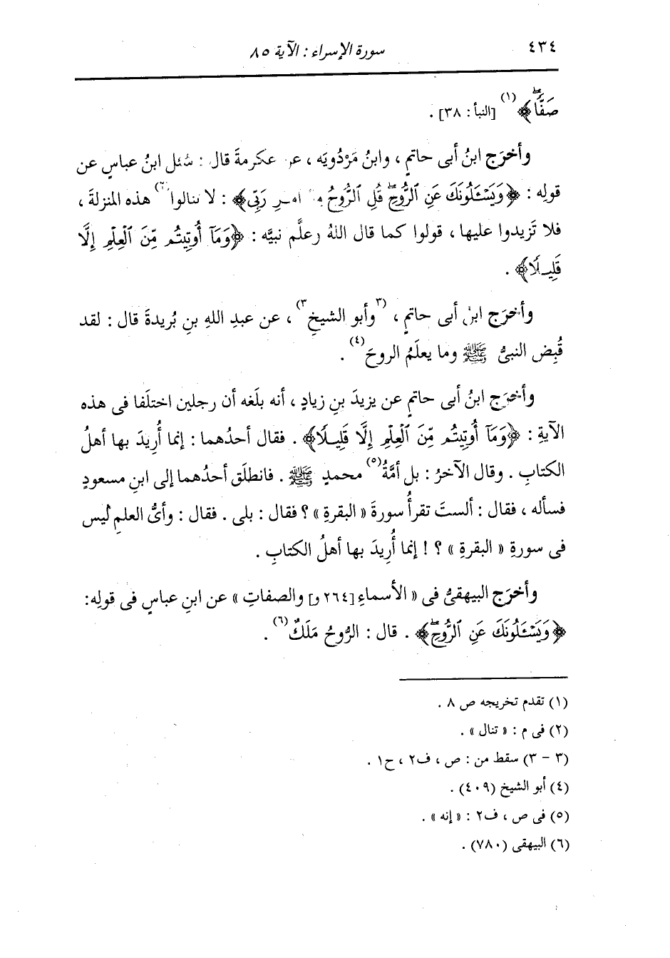 وأخرج ابن أبي حاتم عن يزيد بن زياد أنه بلغه أن رجلين اختلفا في هذه الآية {وما أوتيتم من العلم إلا قليلا} فقال أحدهما : إنما أريد بها أهل الكتاب وقال الآخر : بل إنه محمد صلى الله عليه وسلم ، فانطلق أحدهما إلى ابن مسعود رضي الله عنه فسأله فقال : ألست تقرأ سورة البقرة فقال : بلى ، فقال : وأي العلم ليس في سورة البقرة إنما أريد بها أهل الكتاب.