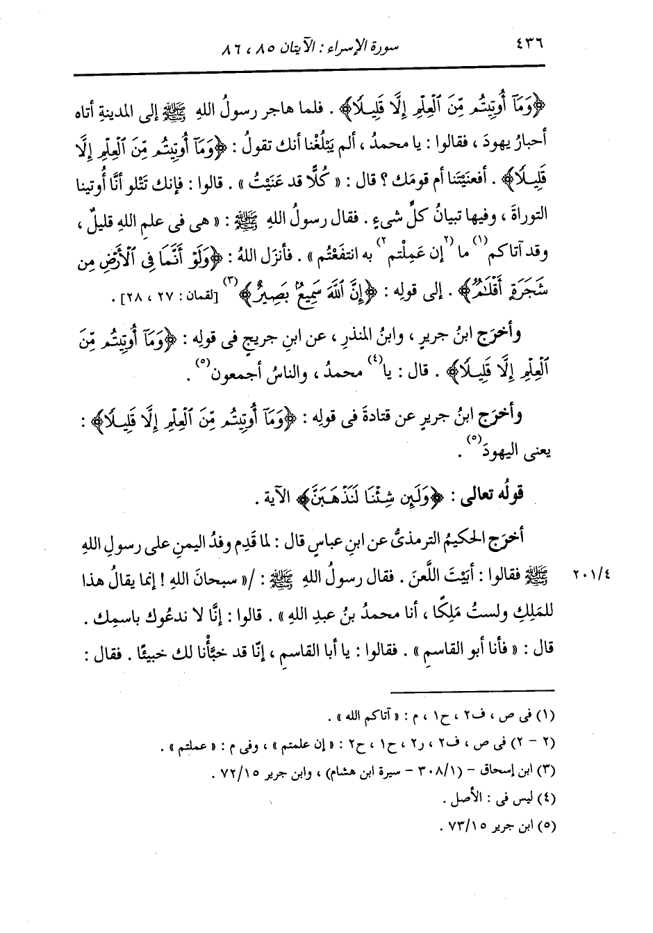 {وما أوتيتم من العلم إلا قليلا} فلما هاجر رسول الله صلى الله عليه وسلم صلى الله عليه وسلم إلى المدينة أتاه أحبار اليهود فقالوا : يا محمد ألم يبلغنا أنك تقول : {وما أوتيتم من العلم إلا قليلا} أفعنيتنا أم قومك قال : كلا قد عنيت ، قالوا : فإنك تتلو أنا أوتينا التوراة وفيها تبيان كل شيء فقال رسول الله صلى الله عليه وسلم : هي في علم الله قليل وقد آتاكم الله ما عملتم به انتفعتم ، فأنزل الله (ولو أن ما في الأرض من شجرة أقلام) إلى قوله : (إن الله سميع بصير) (لقمان آية 27 - 28).