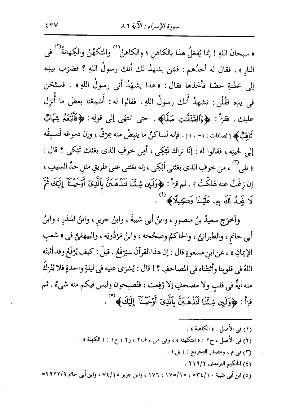 وأخرج سعيد بن منصور ، وَابن أبي شيبة ، وَابن جَرِير ، وَابن المنذر ، وَابن أبي حاتم والطبراني والحاكم وصححه ، وَابن مردويه والبيهقي في شعب الإيمان عن ابن مسعود قال : إن هذا القرآن سيرفع ، قيل : كيف يرفع وقد أثبته الله في قلوبنا وأثبتناه في المصاحف ، قال : يسرى عليه في ليلة واحدة فلا يترك منه آية في قلب ولا مصحف إلا رفعت فتصبحون وليس فيكم منه شيء ، ثم قرأ {ولئن شئنا لنذهبن بالذي أوحينا إليك}.