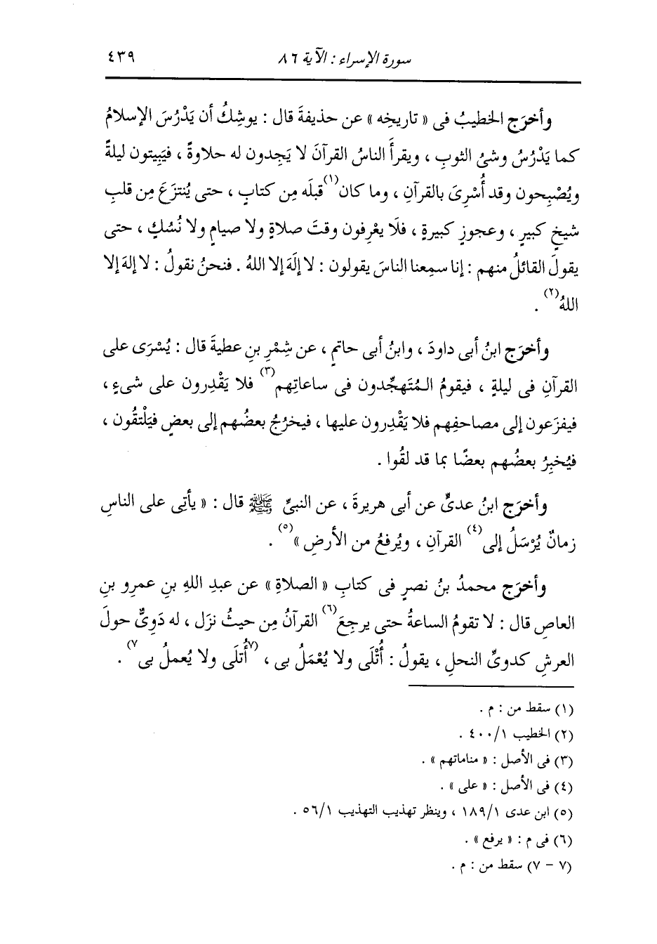 وأخرج ابن أبي داود ، وَابن أبي حاتم عن شمر بن عطية رضي الله عنه قال : يسرى على القران في ليلة فيقوم المتهجدون في ساعاتهم فلا يقدرون على شيء فيفزعون إلى مصاحفهم فلا يقدرون عليها فيخرج بعضهم إلى بعض فيلتقون فيخبر بعضهم بعضا بما قد لقوا.
