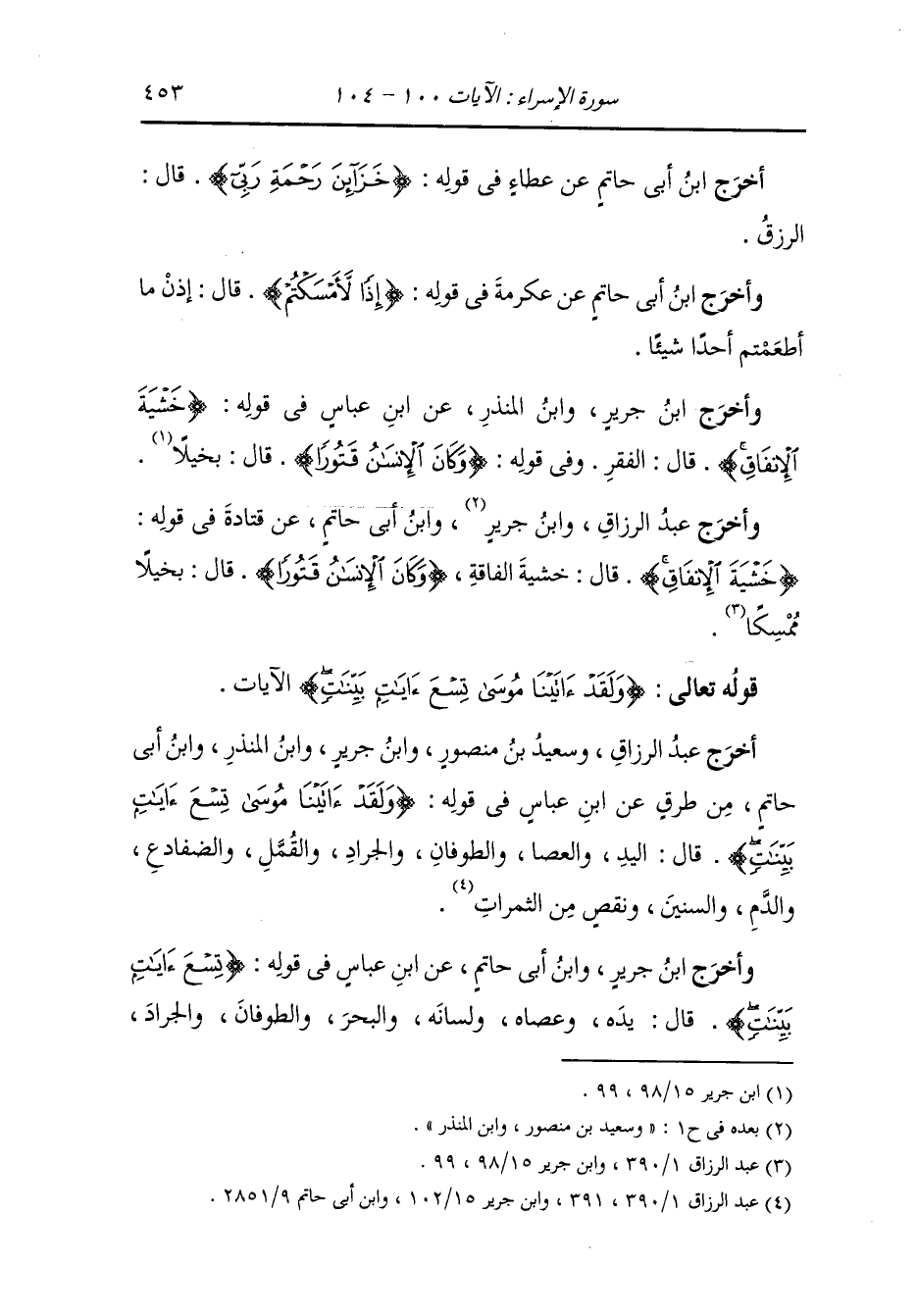 أَخرَج عبد الرزاق وسعيد بن منصور ، وَابن جَرِير ، وَابن المنذر ، وَابن أبي حاتم من طرق عن ابن عباس رضي الله عنهما في قوله : {ولقد آتينا موسى تسع آيات بينات} قال : اليد والعصا والطوفان والجراد والقمل والضفادع والدم والسنين ونقص من الثمرات.
