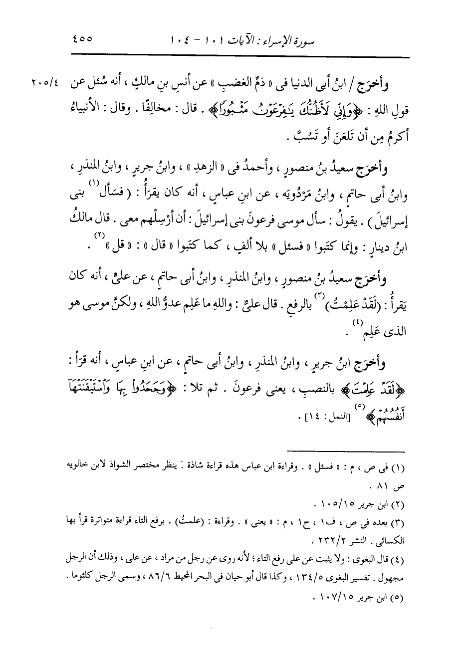 وأخرج سعيد بن منصور وأحمد في الزهد ، وَابن جَرِير ، وَابن المنذر ، وَابن أبي حاتم ، وَابن مردويه عن ابن عباس رضي الله عنهما أنه كان يقرأ {فاسأل بني إسرائيل} يقول : سأل موسى فرعون بني إسرائيل أن أرسلهم معي ، قال مالك بن دينار : وإنما كتبوا فسل بلا ألف كما كتبوا قال : قل.