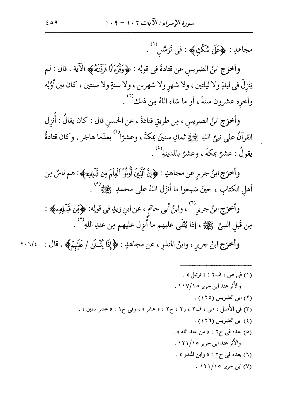 وأخرج ابن الضريس عن قتادة في قوله : {وقرآنا فرقناه} الآية ، قال : لم ينزل في ليلة ولا ليلتين ولا شهر ولا شهرين ولا سنة ولا سنتين وكان بين أوله وآخره عشرون سنة أو ما شاء الله من ذلك.