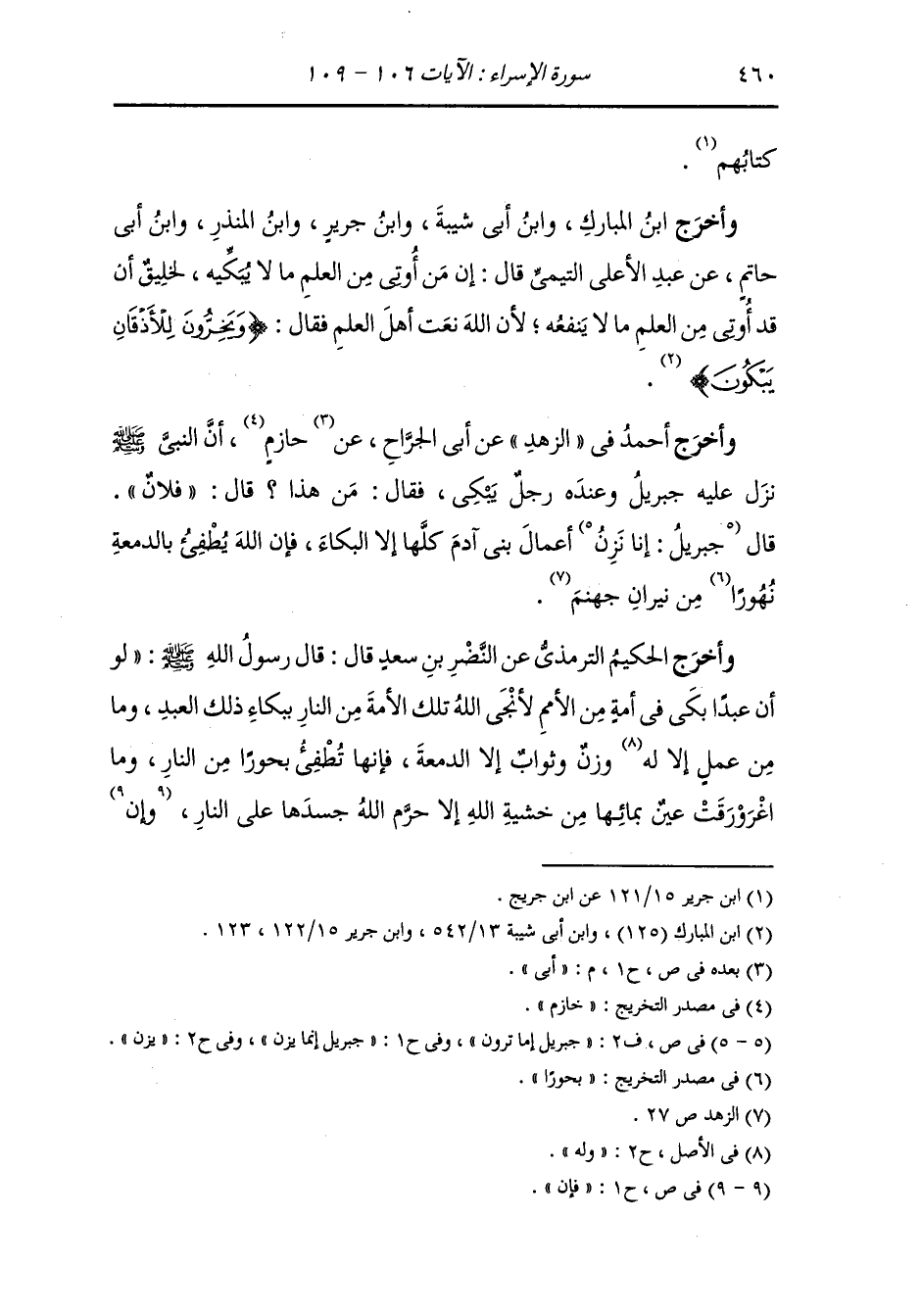 وأخرج ابن المبارك ، وَابن أبي شيبة ، وَابن جَرِير ، وَابن المنذر ، وَابن أبي حاتم عن عبد الأعلى التيمي قال : إن من أوتي من العلم ما لا يبكيه لخليق أن قد أوتي من العلم ما لا ينفعه لأن الله نعت أهل العلم فقال : {ويخرون للأذقان يبكون}.