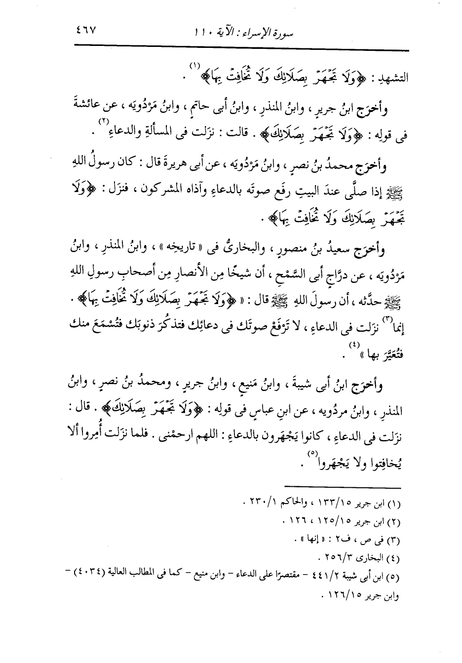 وأخرج ابن أبي شيبة ، وَابن منيع ، وَابن جَرِير ومحمد بن نصر ، وَابن المنذر ، وَابن مردويه عن ابن عباس رضي الله عنهما في قوله : {ولا تجهر بصلاتك} قال : نزلت في الدعاء كانوا يجهرون بالدعاء : اللهم ارحمني ، فلما نزلت أمروا أنى لا يخافتوا ولا يجهروا.