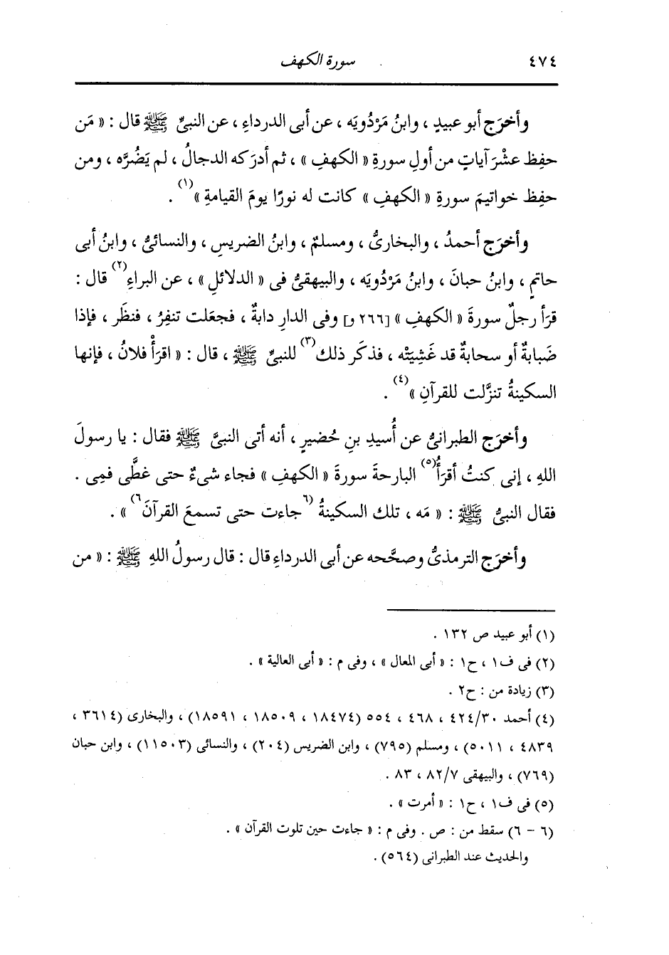 وأخرج أحمد والبخاري ومسلم ، وَابن الضريس والنسائي ، وَابن أبي حاتم ، وَابن حبان ، وَابن مردويه والبيهقي في الدلائل عن أبي العالية قال : قرأ رجل سورة الكهف وفي الدار دابة فجعلت تنفر ، فينظر فإذا ضبابة أو سحابة قد غشيته فذكر للنبي صلى الله عليه وسلم قال : أقرا فلان فإنها السكينة نزلت للقرآن.