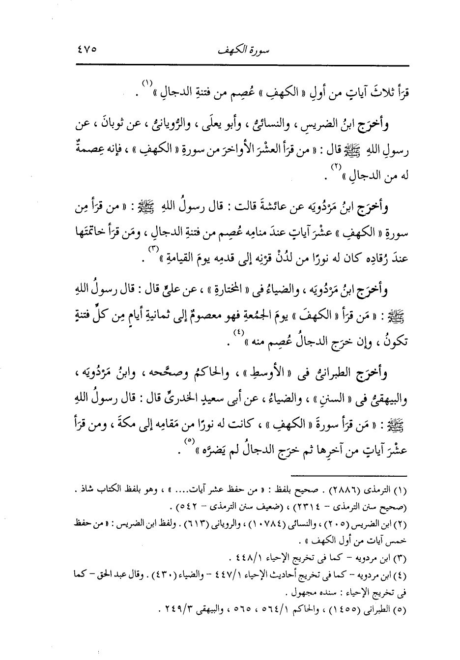 وأخرج ابن الضريس والنسائي وأبو يعلى والروياني عن ثوبان عن رسول الله صلى الله عليه وسلم قال : من قرأ العشر الأواخر من سورة الكهف فإنه عصمة له من الدجال.