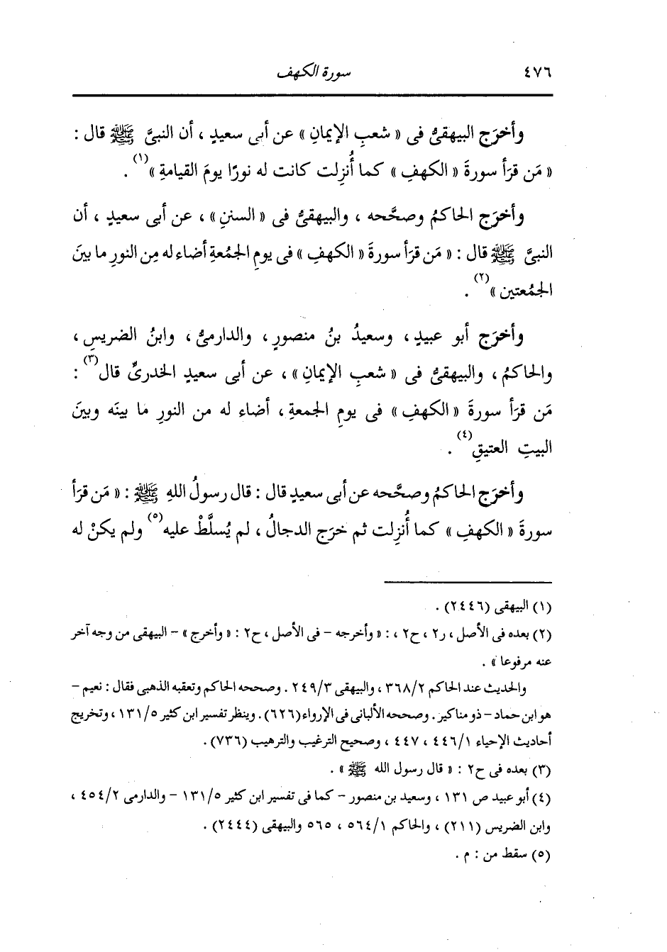 وأخرج الحاكم وصححه والبيهقي في السنن عن أبي سعيد أن النَّبِيّ صلى الله عليه وسلم قال : من قرأ سورة الكهف في يوم الجمعة أضاء له من النور ما بين الجمعتين.