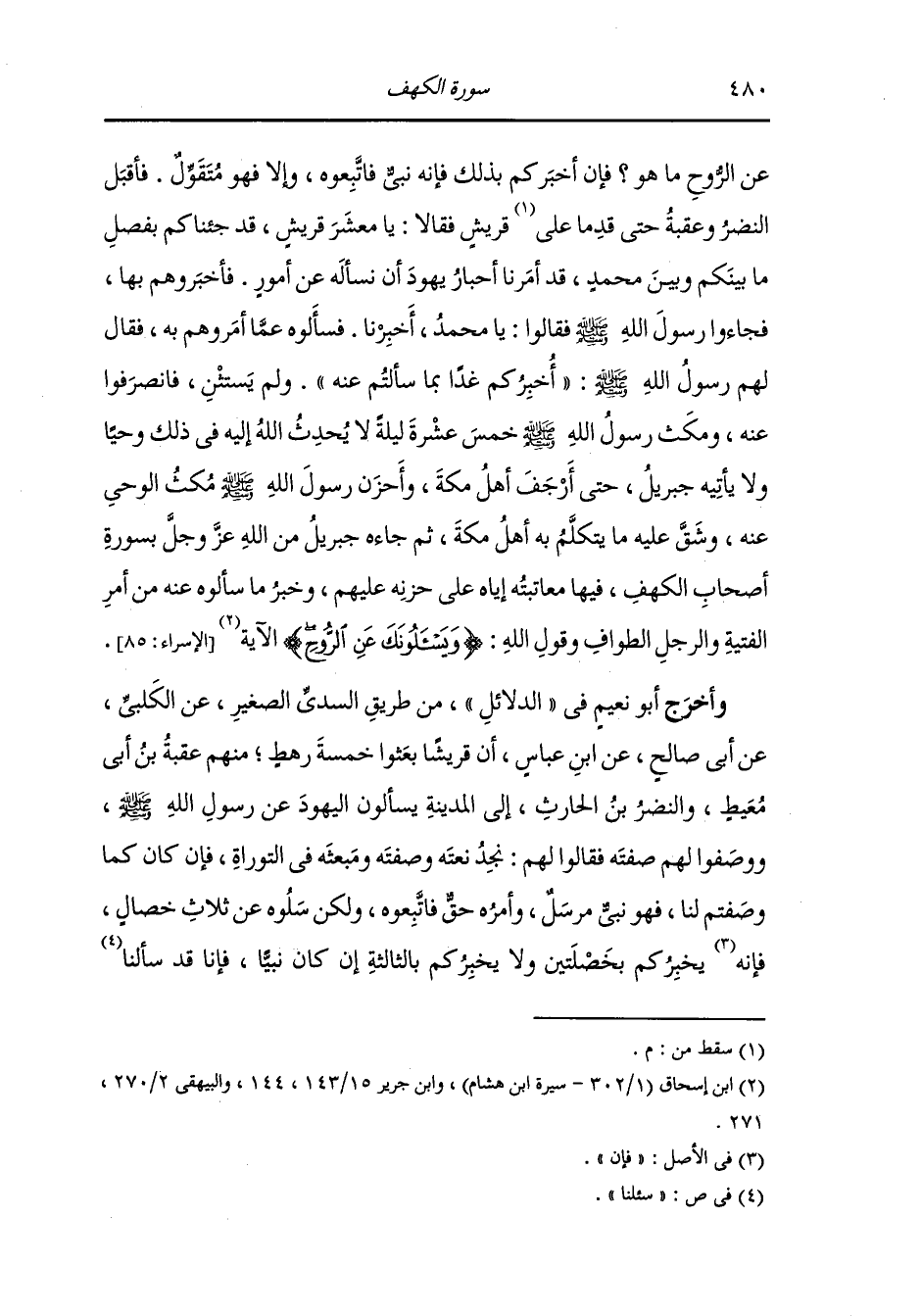 وأخرج أبو نعيم في الدلائل من طريق السدي الصغير عن الكلبي عن أبي صالح عن ابن عباس : أن قريشا بعثوا خمسة رهط - منهم عقبة بن أبي معيط والنضر بن الحارث - يسألون اليهود عن رسول الله صلى الله عليه وسلم ووصفوا لهم صفته فقالوا لهم : نجد نعته وصفته ومبعثه في التوراة فإن كان كما وصفتم لنا فهو نبي مرسل وأمره حق فاتبعه ولكن سلوه عن ثلاث خصال فإنه يخبركم
