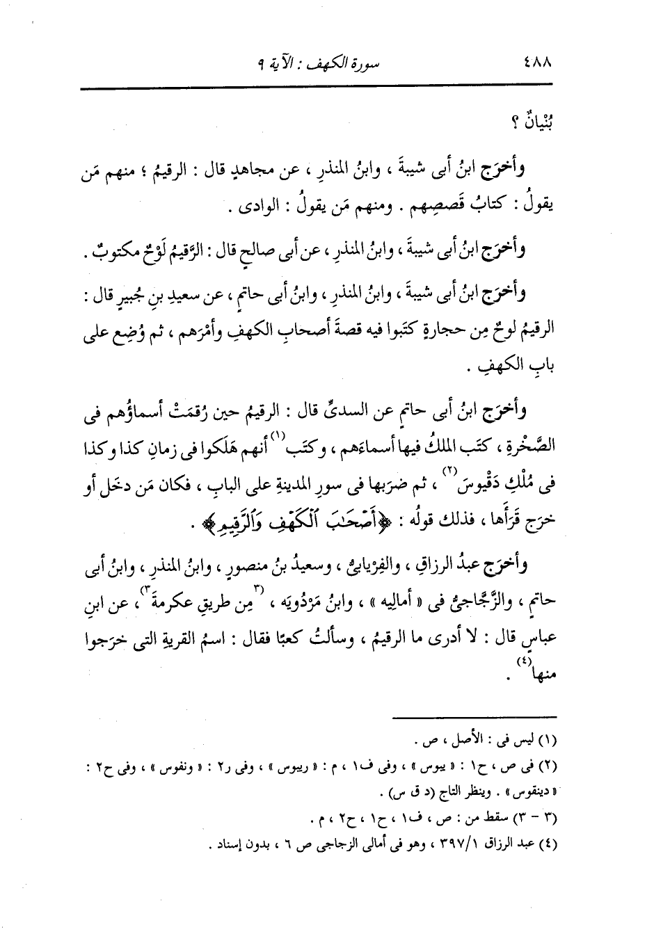 وأخرج سعيد بن منصور وعبد الرزاق والفريابي ، وَابن المنذر ، وَابن أبي حاتم والزجاجي في أماليه ، وَابن مردويه عن ابن عباس قال : لا أدري ما الرقيم وسألت كعبا فقال : اسم القرية التي خرجوا منها.