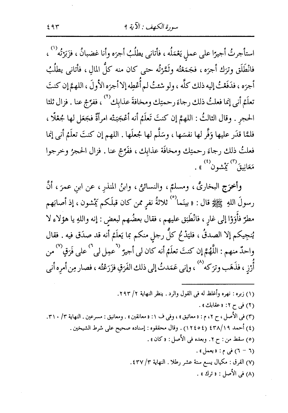 وأخرج البخاري ومسلم والنسائي ، وَابن المنذر عن ابن عمر أن رسول الله صلى الله عليه وسلم قال : بينما ثلاثة نفر ممن كان قبلكم يمشون إذ أصابهم مطر فأووا إلى غار فانطبق عليهم فقال بعضهم لبعض : إنه والله يا هؤلاء لا ينجيكم إلا الصدق فليدع كل رجل منكم بما يعلم أنه قد صدق فيه ، فقال واحد منهم : اللهم إن كنت تعلم أنه كان لي أجير يعلم على فرق من أرز فذهب وتركه وإني عمدت إلى ذلك الفرق فزرعته فصار من أمره أني