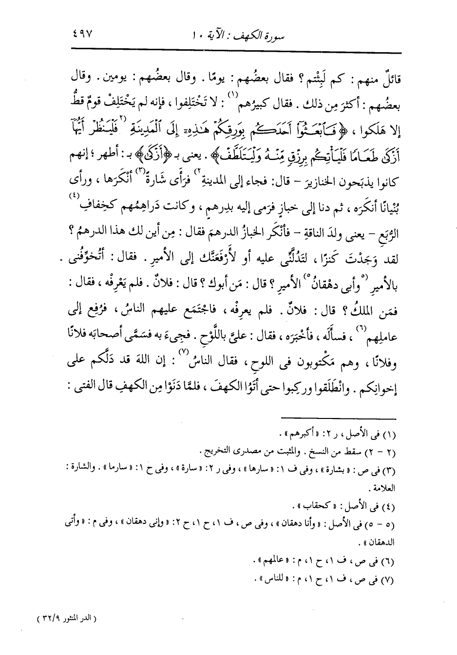 يختلف قوم قط إلا هلكوا فابعثوا أحدكم بورقكم هذه إلى المدينة ، فرأى شارة أنكرها ورأى بنيانا أنكره ثم دنا إلى خباز فرمى إليه بدرهم وكانت دراهمهم كخفاف الربع - يعني ولد الناقة - فأنكر الخباز الدرهم فقال : من أين لك الدرهم لقد وجدت كنزا لتدلني عليه أو لأرفعنك إلى الأمير ، فقال : أو تخوفني بالأمير وأتى الدهقان الأمير قال : من أبوك قال : فلان ، فلم يعرفه ، قال : فمن الملك قال : فلان ، فلم يعرفه فاجتمع عليهم الناس فرفع إلى عالمهم فسأله فأخبره فقال : علي باللوح فجيء به فسمى أصحابه فلانا وفلانا ، وهم مكتوبون في اللوح فقال للناس : إن الله قد دلكم على إخوانكم ، وانطلقوا وركبوا حتى أتوا إلى الكهف فلما دنوا من الكهف قال الفتى :
