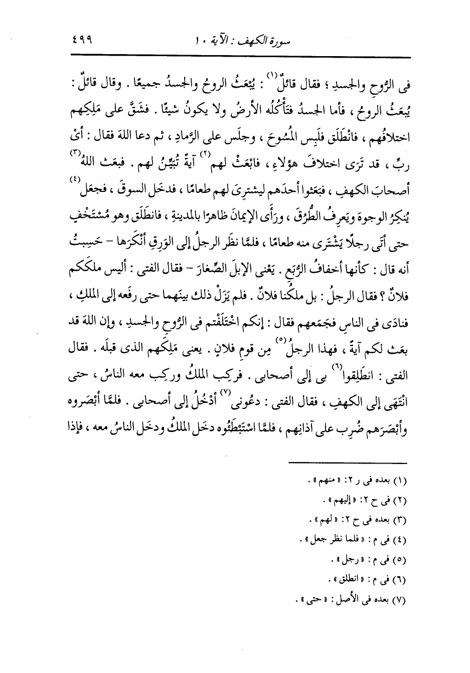 في الروح والجسد فقال قائل : يبعث الروح والجسد جميعا ، وقال قائل : يبعث الروح وأما الجسد فتأكله الأرض فلا يكون شيئا فشق على ملكهم إختلافهم فانطلق فلبس المسوح وجلس على الرماد ثم دعا الله فقال : أي رب قد ترى إختلاف هؤلاء فابعث لهم آية تبين لهم فبعث الله أصحاب الكهف فبعثوا أحدهم ليشتري لهم طعاما فدخل السوق فلما نظر جعل ينكر الوجوه ويعرف الطرق ورأى الإيمان ظاهرا بالمدينة ، فانطلق وهو مستخف حتى أتى رجلا يشتري منه طعاما فلما نظر الرجل إلى الورق أنكرها ، حسبت أنه قال : كأنها أخفاف الربيع - يعني الإبل الصغار - فقال الفتى : أليس ملككم فلان قال الرجل : بل ملكنا فلان ، فلم يزل ذلك بينهما حتى رفعه إلى الملك فنادى في الناس فجمعهم فقال : إنكم اختلفتم في الروح والجسد وإن الله قد بعث لكم آية فهذا رجل من قوم فلان - يعني ملكهم الذي