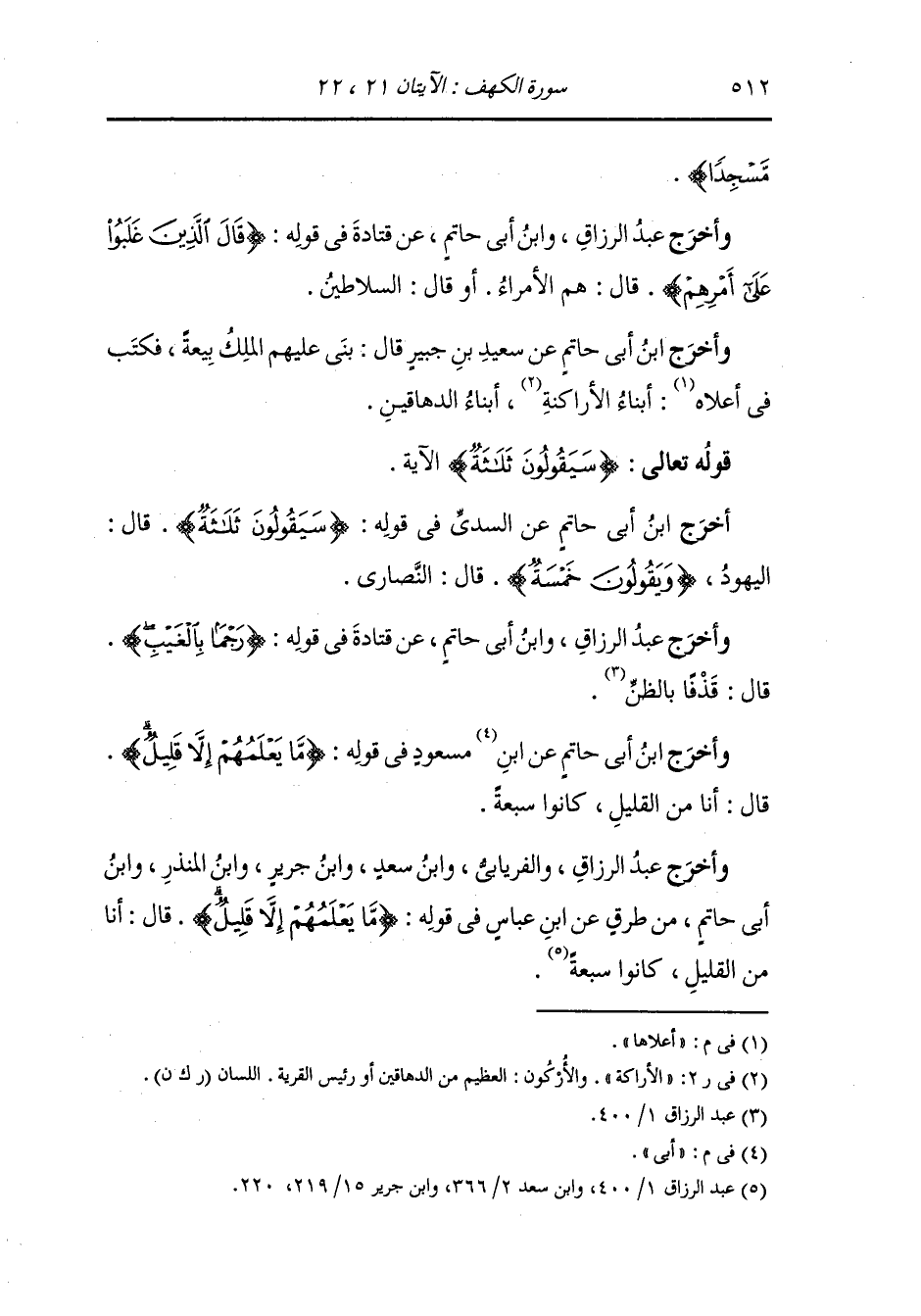 وأخرج ابن أبي حاتم عن أبي مسعود رضي الله عنه في قوله {ما يعلمهم إلا قليل} قال : إنا من القليل كانوا سبعة.