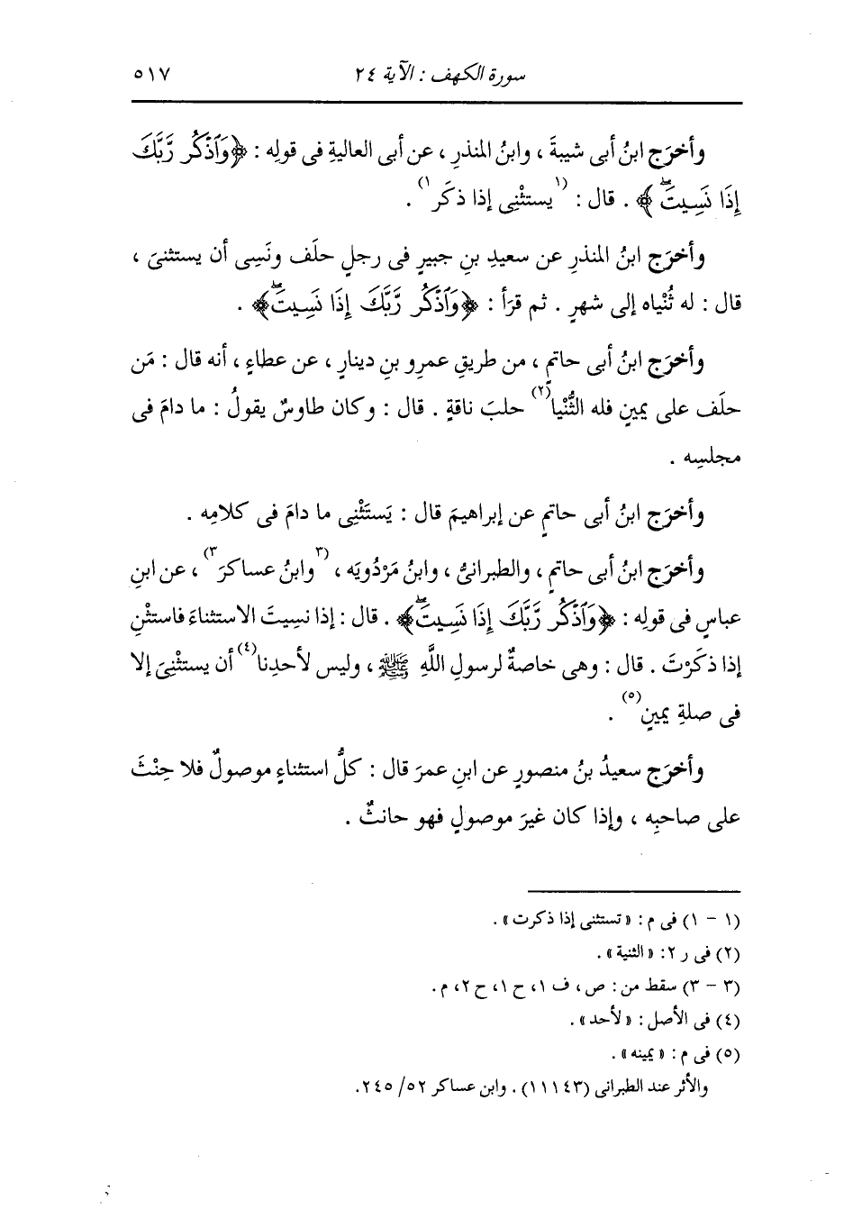 وأخرج ابن أبي شيبة ، وَابن المنذر عن أبي العالية في قوله : {واذكر ربك إذا نسيت} قال : تستثني إذا ذكرت.