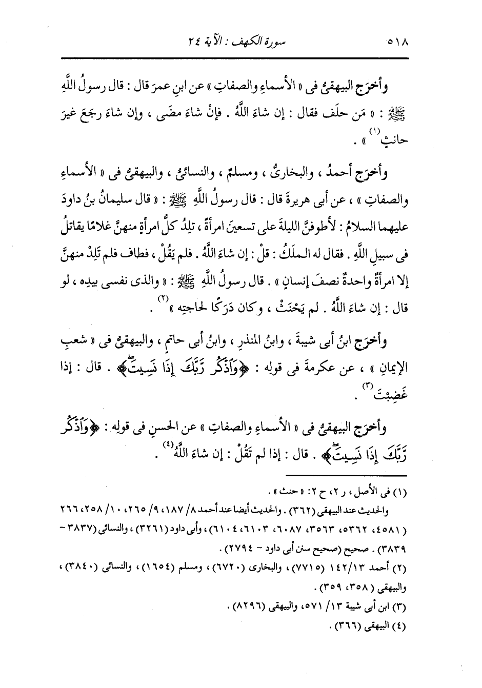 وأخرج أحمد والبخاري ومسلم والنسائي والبيهقي في الأسماء والصفات عن أبي هريرة قال : قال رسول الله صلى الله عليه وسلم : قال سليمان بن داود عليهما السلام : لأطوقن الليلة على تسعين امرأة تلد كل امرأة منهن غلاما يقاتل في سبيل الله ، فقال له الملك : قل إن شاء الله فلم يقل ، فطاف فلم تلد منهن إلا امرأة واحدة نصف إنسأن ، قال رسول الله صلى الله عليه وسلم : والذي نفسي بيده لو قال إن شاء الله لم يحنث وكان دركا لحاجته.