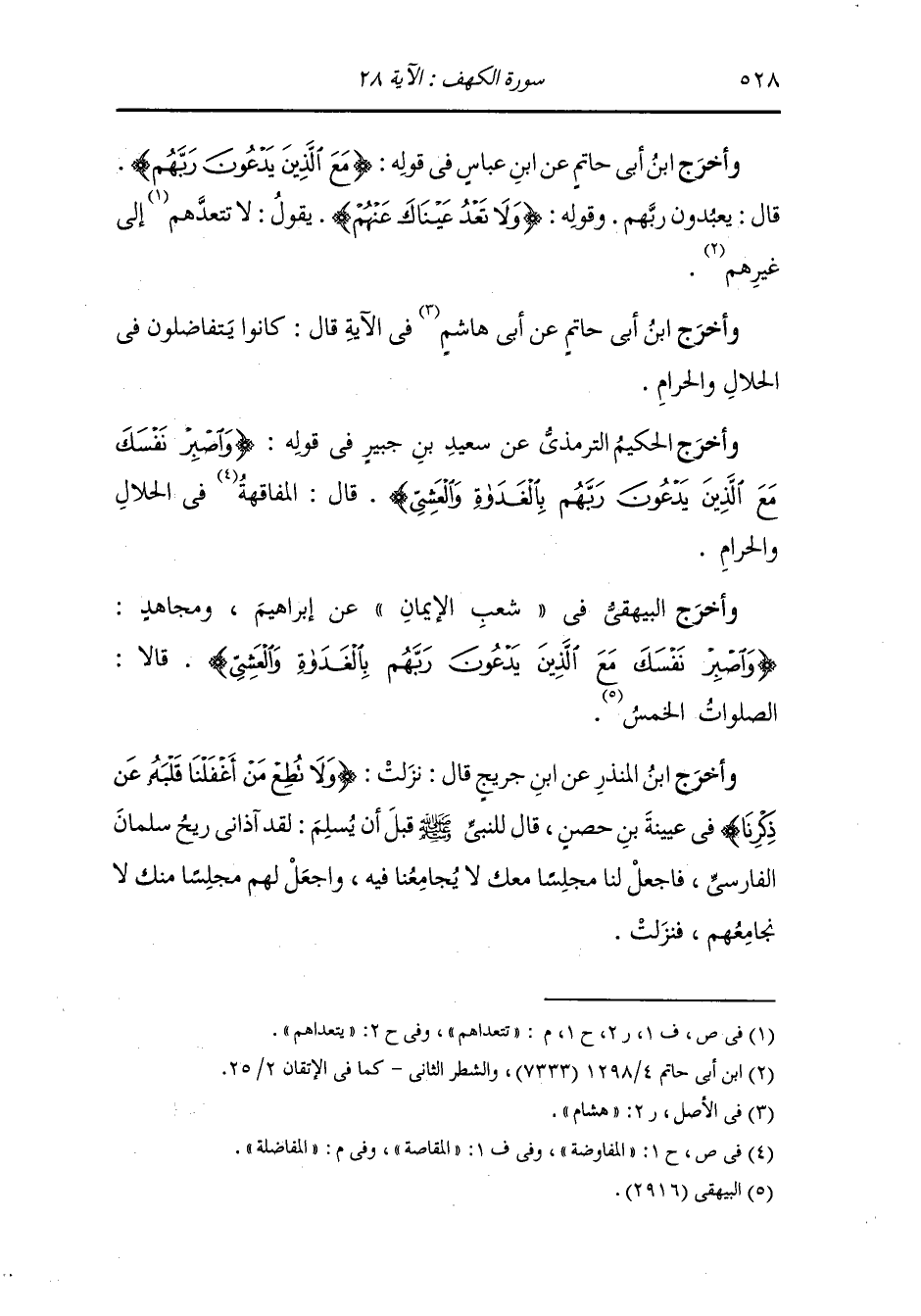 وأخرج الحكيم الترمذي عن سعيد بن جبير في قوله : {واصبر نفسك مع الذين يدعون ربهم بالغداة والعشي} قال : المفاضلة في الحلال والحرام.