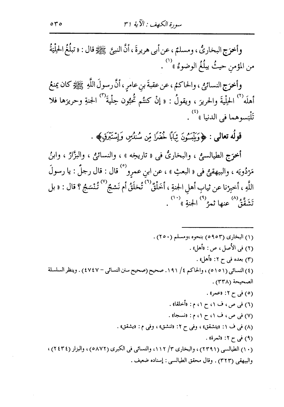 وأخرج الطيالسي والبخاري في تاريخه والنسائي والبزار ، وَابن مردويه والبيهقي في البعث عن ابن عمرو قال : قال رجل : يا رسول الله أخبرنا عن ثياب أهل الجنة ، أخلقا تخلق أم نسجا تنسج قال : بل يشقق عنها ثمر الجنة.
