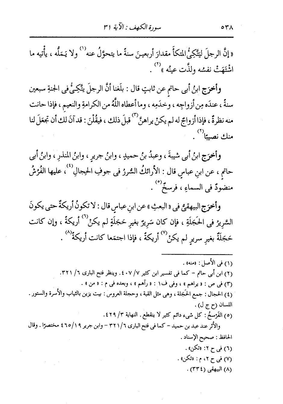 وأخرج ابن أبي حاتم عن ثابت قال : بلغنا أن الرجل يتكئ في الجنة سبعين سنة عنده من أزواجه وخدمه وما أعطاه الله من الكرامة والنعيم فإذا حانت منه نظرة فإذا أزواج له لم يكن يراهن من قبل ذلك فيقلن : قد آن لك أن تجعل لنا منك نصيبا.