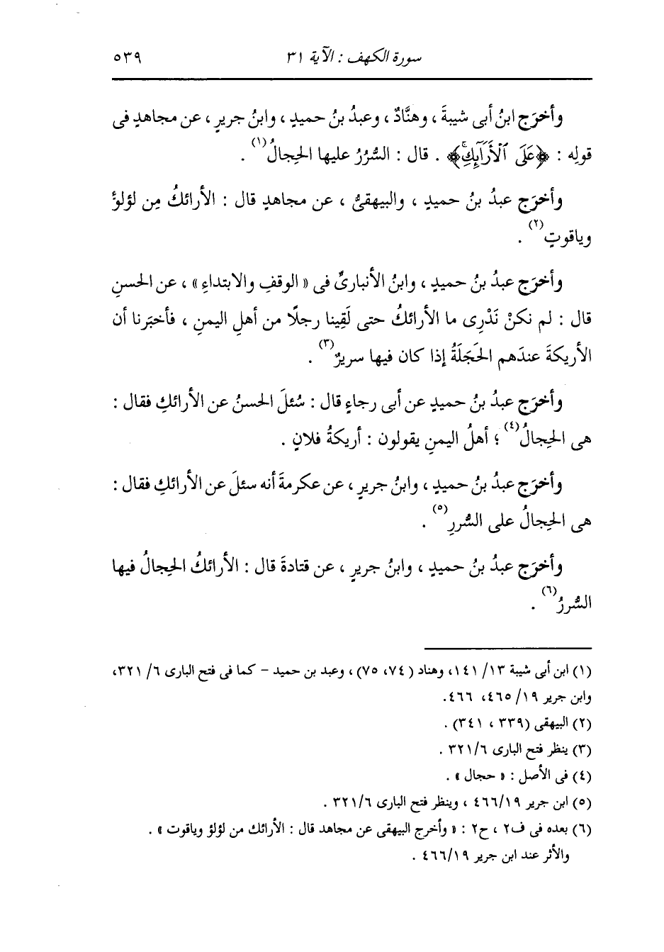 وأخرج عَبد بن حُمَيد عن أبي رجاء قال : سئل الحسن رضي الله عنه عن الأرائك فقال : هي الحجال أهل اليمن يقولون أريكة فلان.