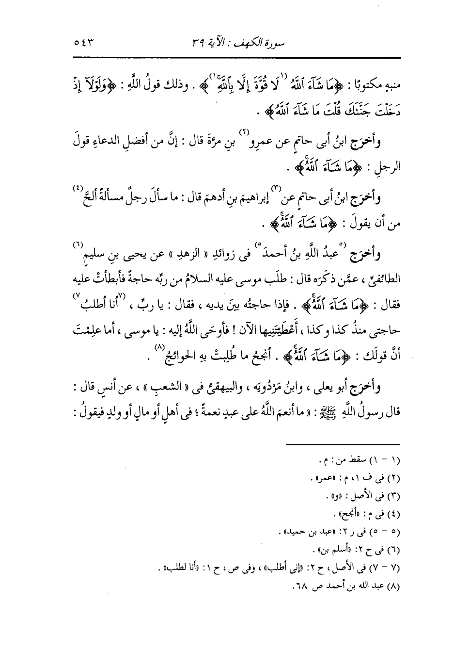 وأخرج عبد الله بن أحمد في زوائد الزهد عن يحيى بن سليم الطائفي عمن ذكره قال : طلب موسى عليه السلام من ربه حاجة فأبطأت عليه فقال : {ما شاء الله} فإذا حاجته بين يديه فقال : يا رب أنا أطلب حاجتي منذ كذا وكذا أعطيتنيها الآن فأوحى الله إليه يا موسى أما علمت أن قولك : {ما شاء الله} أنجح ما طلبت به الحوائج.