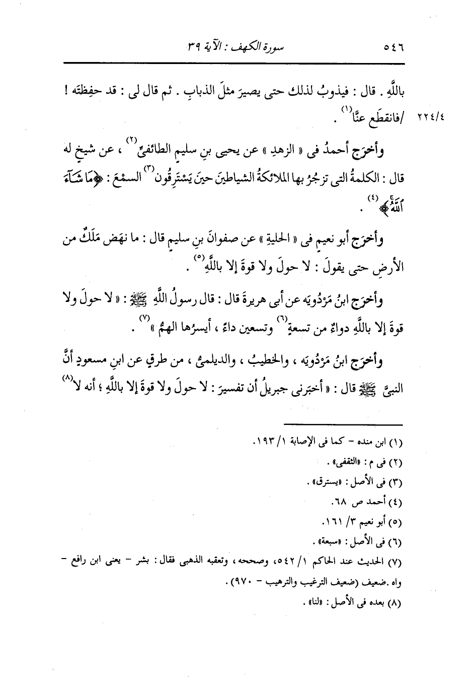 وأخرج ابن أبي شيبة عن زيد بن ثابت : أن رسول الله صلى الله عليه وسلم كان يقول : ألا أدلكم على كنز من كنوز الجنة تكثرون من لا حول ولا قوة إلا بالله.