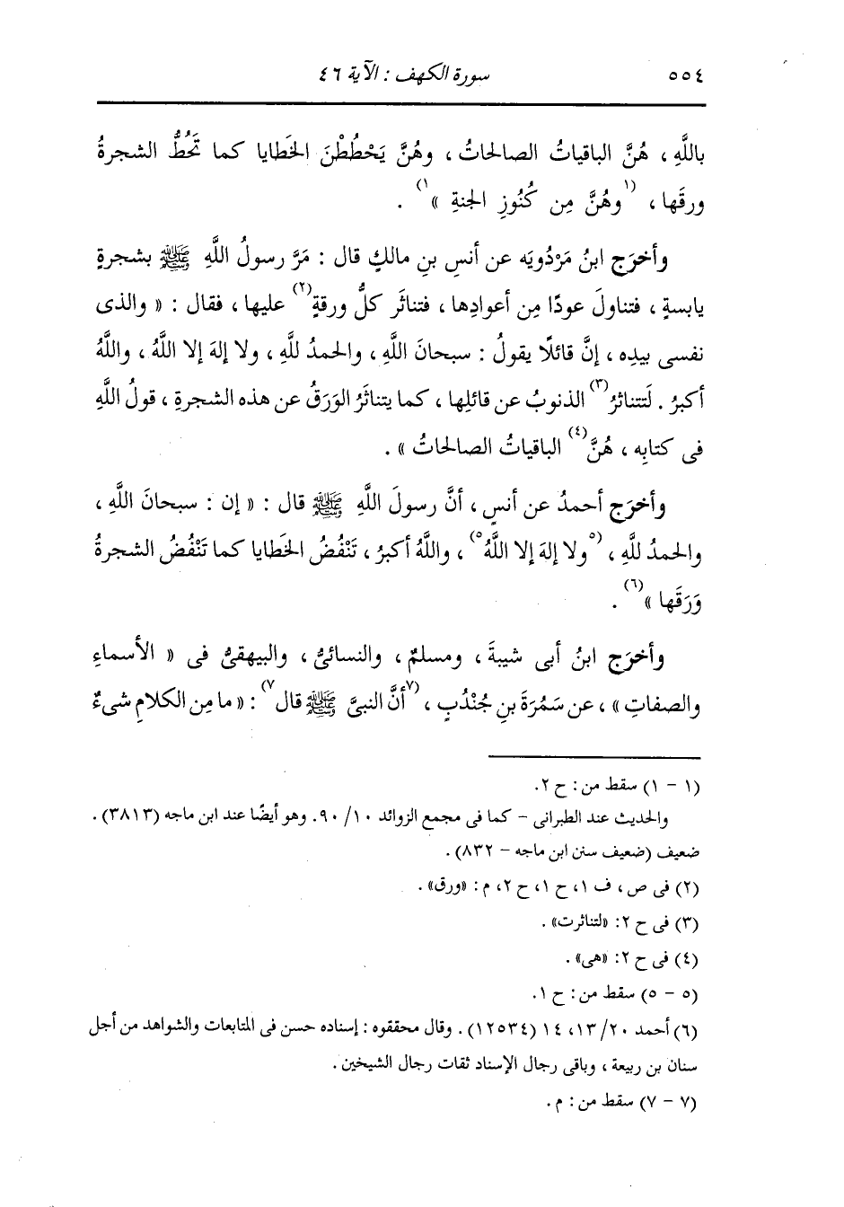 وأخرج النسائي ، وَابن جَرِير ، وَابن أبي حاتم والطبراني في الصغير والحاكم وصححه ، وَابن مردويه والبيهقي عن أبي هريرة قال : قال رسول الله صلى الله عليه وسلم : خذوا جنتكم قيل : يا رسول الله أمن عدو قد حضر قال : لا ، بل جنتكم من النار قول : سبحان الله والحمد لله ولا إله إلا الله والله أكبر فإنهن يأتين يوم القيامة مقدمات معقبات محسنات وهن الباقيات الصالحات.