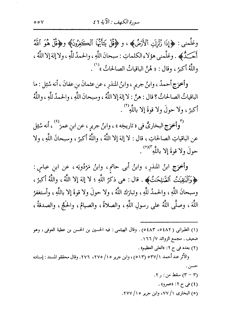 وأخرج ابن مردويه عن علي : أن رسول الله صلى الله عليه وسلم قال : الباقيات الصالحات من قال : لا إله إلا الله والله أكبر وسبحان الله والحمد لله ولا حول ولا قوة إلا بالله.