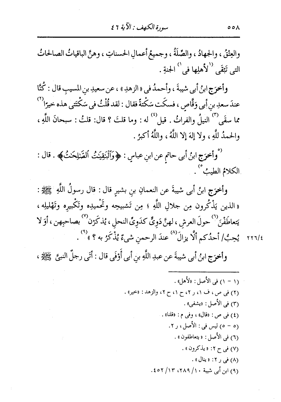 وأخرج أحمد ، وَابن جَرِير ، وَابن المنذر عن عثمان بن عفان أنه سئل عن {والباقيات الصالحات} قال : هي لا إله إلا الله وسبحان الله والحمد لله والله أكبر ولا حول ولا قوة إلا بالله.