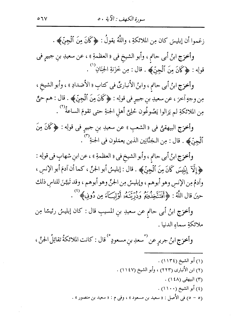 وأخرج ابن جرير ، وَابن الأنباري في كتاب الأضداد وأبو الشيخ في العظمة عن الحسن قال : ما كان إبليس من الملائكة طرفة عين وإنه لأصل الجن كما أن آدم أصل الإنس.