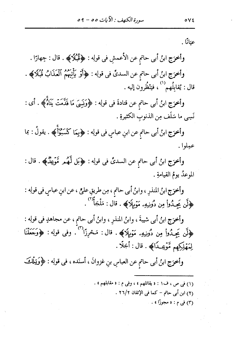 وأخرج ابن أبي شيبة ، وَابن المنذر ، وَابن أبي حاتم عن مجاهد في قوله : {أو يأتيهم العذاب قبلا} قال : فجأة.