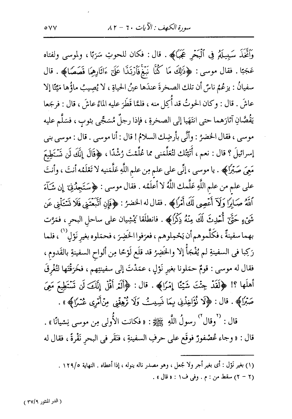 وأخرج البخاري ومسلم والترمذي والنسائي ، وَابن جَرِير ، وَابن المنذر ، وَابن أبي حاتم ، وَابن مردويه والبيهقي في الأسماء والصفات من طريق سعيد بن جبير قال : قلت لابن عباس أن نوفا البكالي يزعم أن موسى صاحب الخضر ليس موسى صاحب بني إسرائيل : قال ابن عباس : كذب عدو الله ، حدثنا أبي بن كعب أنه سمع رسول الله صلى الله عليه وسلم يقول : إن موسى قام خطيبا في بني إسرائيل فسئل : أي الناس أعلم فقال : أنا ، فعتب الله عليه إذ لم يرد العلم إليه فأوحى الله إليه : أن لي عبدا بمجمع البحرين وهو أعلم منك ، قال موسى : يا رب كيف لي به قال : تأخذ معك حوتا تجعله في مكتل فحيثما فقدت الحوت فهو ثم ، فأخذ حوتا فجعله في مكتل ثم انطلق وانطلق معه فتاه يوشع بن نون حتى إذا أتيا الصخرة وضعا رأسيهما فناما واضطرب الحوت في المكتل فخرج منه فسقط في البحر {فاتخذ سبيله في البحر سربا} وأمسك الله عن الحوت جرية الماء فصار عليه مثل الطاق فلما استيقظ نسي صاحبه أن يخبرهه بالحوت فانطلقا بقية يومهما وليلتهما حتى إذا كان من الغد