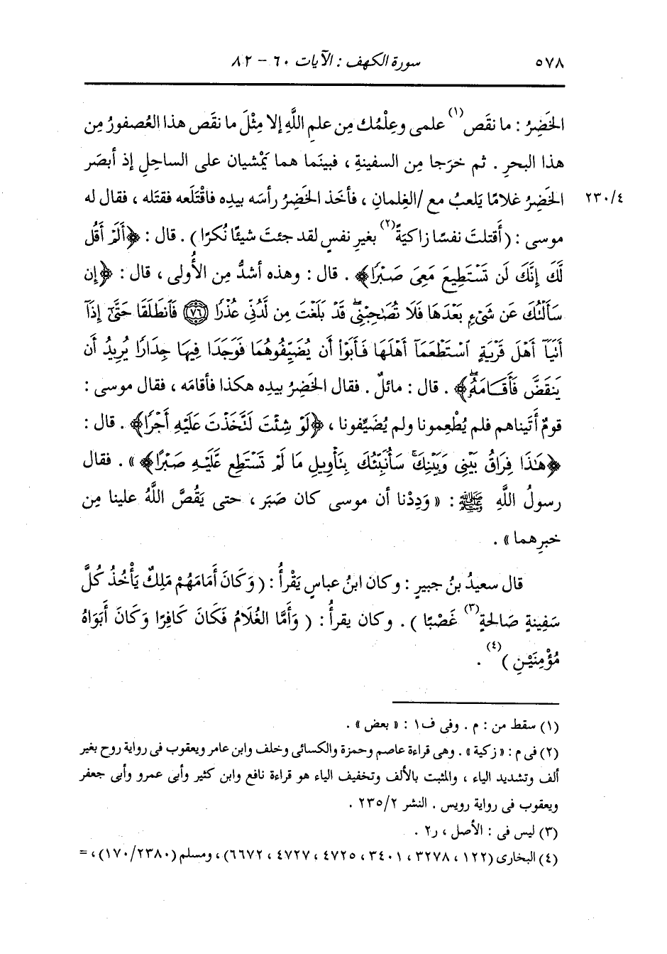 واتخذ سبيله في البحر عجبا} قال : فكان للحوت سربا ولموسى ولفتاه عجبا ، فقال موسى {ذلك ما كنا نبغ فارتدا على آثارهما قصصا} قال سفيان : يزعم ناس أن تلك الصخرة عندها عين الحياة ولا يصيب ماؤها ميتا إلا عاش ، قال : وكان الحوت قد أكل منه فلما قطر عليه الماء عاش ، قال : فرجعا يقصان آثارهما حتى انتهيا إلى الصخرة فإذا رجل مسجى بثوب فسلم عليه موسى فقال الخضر : وأنى بأرضك السلام قال : أنا موسى ، قال : موسى بني إسرائيل قال : نعم أتيتك لتعلمني مما علمت رشدا {قال إنك لن تستطيع معي صبرا} يا موسى إني على علم من علم الله علمنيه لا تعلمه أنت وأنت على علم من علم الله علمك الله لا أعلمه ، فقال موسى {ستجدني إن شاء الله صابرا ولا أعصي لك أمرا} فقال له الخضر {فإن اتبعتني فلا تسألني عن شيء حتى أحدث لك منه ذكرا فانطلقا} يمشيان على ساحل البحر فمرت بهم سفينة فكلموهم أن يحملوهم فعرفوا الخضر فحملوه بغير نول فلما ركبوا في السفينة فلم يفجأه إلا والخضر قد قلع لوحا من ألواح السفينة بالقدوم فقال له موسى : قوم حملونا بغير نول عمدت إلى سفينتهم فخرقتها لتغرق أهلها ، {لقد جئت شيئا إمرا} فقال : {ألم أقل إنك لن تستطيع معي صبرا قال لا تؤاخذني بما نسيت ولا ترهقني من أمري عسرا} ، قال رسول الله صلى الله عليه وسلم : كانت الأولى من موسى نسيانا قال : وجاء عصفور فوقع على حرف السفينة فنقر في البحر نقرة فقال له