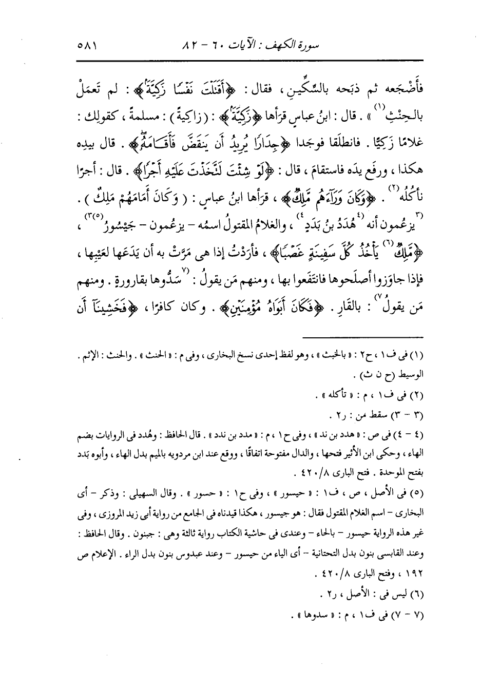 البحر ، حتى إذا ركبا في السفينة وجدا معابر صغارا تحمل أهل الساحل إلى أهل هذا الساحل الآخر فعرفوه فقالوا : عبد الله الصالح لا نحمله بأجر فخرقها ووتد فيها وتدا ، قال موسى {أخرقتها لتغرق أهلها لقد جئت شيئا إمرا قال ألم أقل إنك لن تستطيع معي صبرا} كانت الأولى نسيانا والوسطة والثالثة عمدا {لا تؤاخذني بما نسيت ولا ترهقني من أمري عسرا فانطلقا حتى إذا لقيا غلاما فقتله} ووجد غلمانا يلعبون فأخذ غلاما كافرا ظريفا