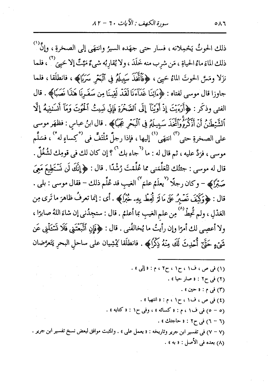 وأخرج من وجه آخر عن سعيد بن جبير قال : جلست عند ابن عباس - وعنده نفر من أهل الكتاب - فقال بعضهم : إن نوفا يزعم عن أبي بن كعب أن موسى النَّبِيّ الذي طلب العلم إنما هو موسى بن ميشا فقال ابن عباس : كذب نوف ، حدثني أبي بن كعب عن رسول الله صلى الله عليه وسلم : أن موسى بني إسرائيل سأل ربه فقال : أي رب إن كان في عبادك أحد أعلم مني فدلني ، قال : نعم في عبادي من هو أعلم منك فنعت له مكانه فأذن له في لقيه فخرج موسى ومعه فتاه ومعه حوت مليح قد قيل : إذا حيي هذا الحوت في مكان فصاحبك هنالك وقد أدركت حاجتك ، فخرج موسى ومعه فتاه ومعه