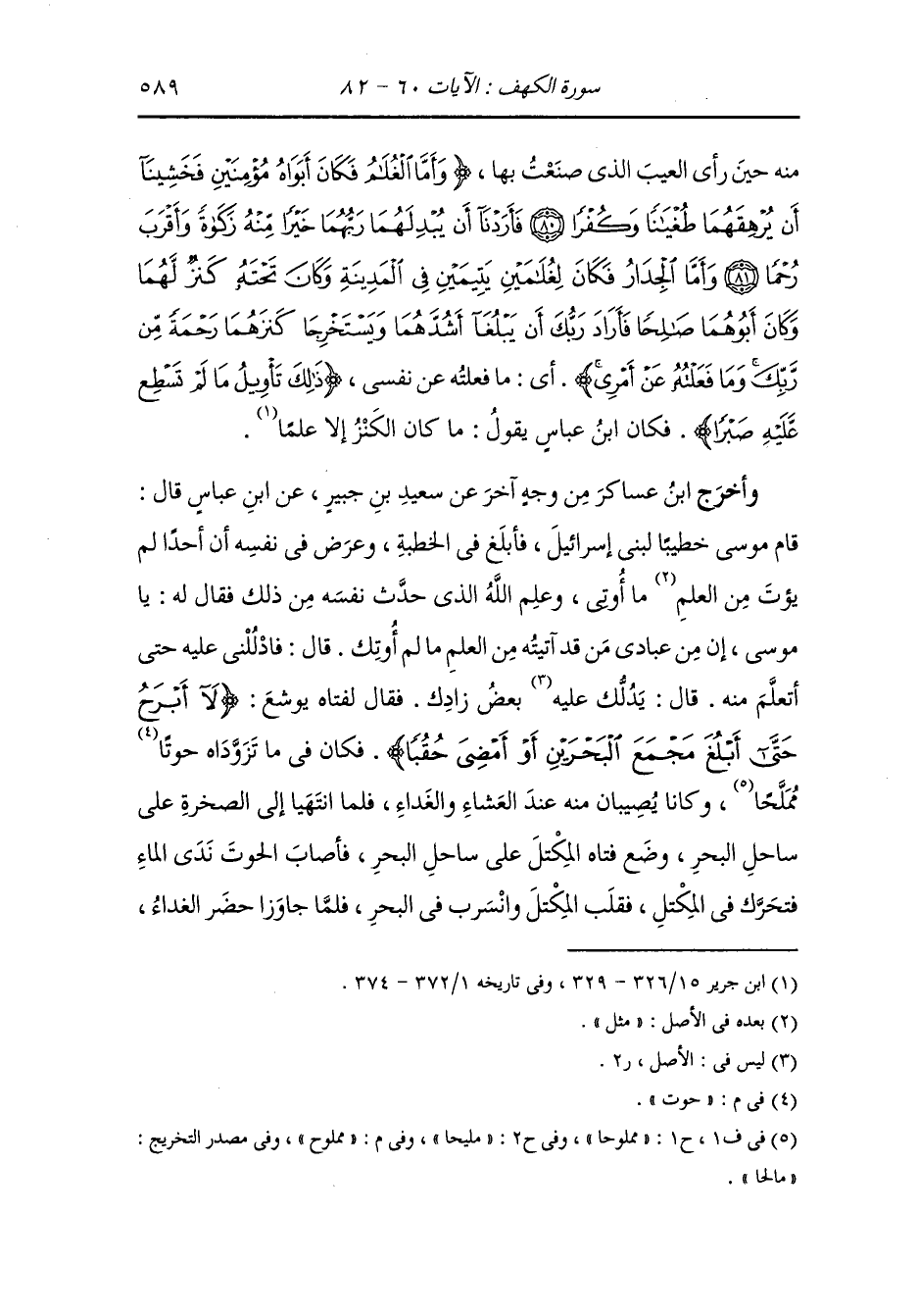 زكية بغير نفس} أي صغيرة {لقد جئت شيئا نكرا قال ألم أقل لك إنك لن تستطيع معي صبرا قال إن سألتك عن شيء بعدها فلا تصاحبني قد بلغت من لدني عذرا} أي قد عذرت في شأني {فانطلقا حتى إذا أتيا أهل قرية استطعما أهلها فأبوا أن يضيفوهما فوجدا فيها جدارا يريد أن ينقض} فهدمه ثم قعد يبنيه فضجر موسى مما يراه يصنع من التكليف وما ليس عليه صبر فقال {لو شئت لاتخذت عليه أجرا} أي قد استطعمناهم فلم يطعمونا واستضفناهم فلم يضيفوهما ثم قعدت تعمل في غير صنيعة ولو شئت لأعطيت عليه أجرا في عملك ، {قال هذا فراق بيني وبينك سأنبئك بتأويل ما لم تستطع عليه صبرا أما السفينة فكانت لمساكين يعملون في البحر فأردت أن أعيبها وكان وراءهم ملك يأخذ كل سفينة} صالحة {غصبا} - في قراءة أبي بن كعب كل سفينة صالحة وإنما عيبها لطرده عنها فسلمت