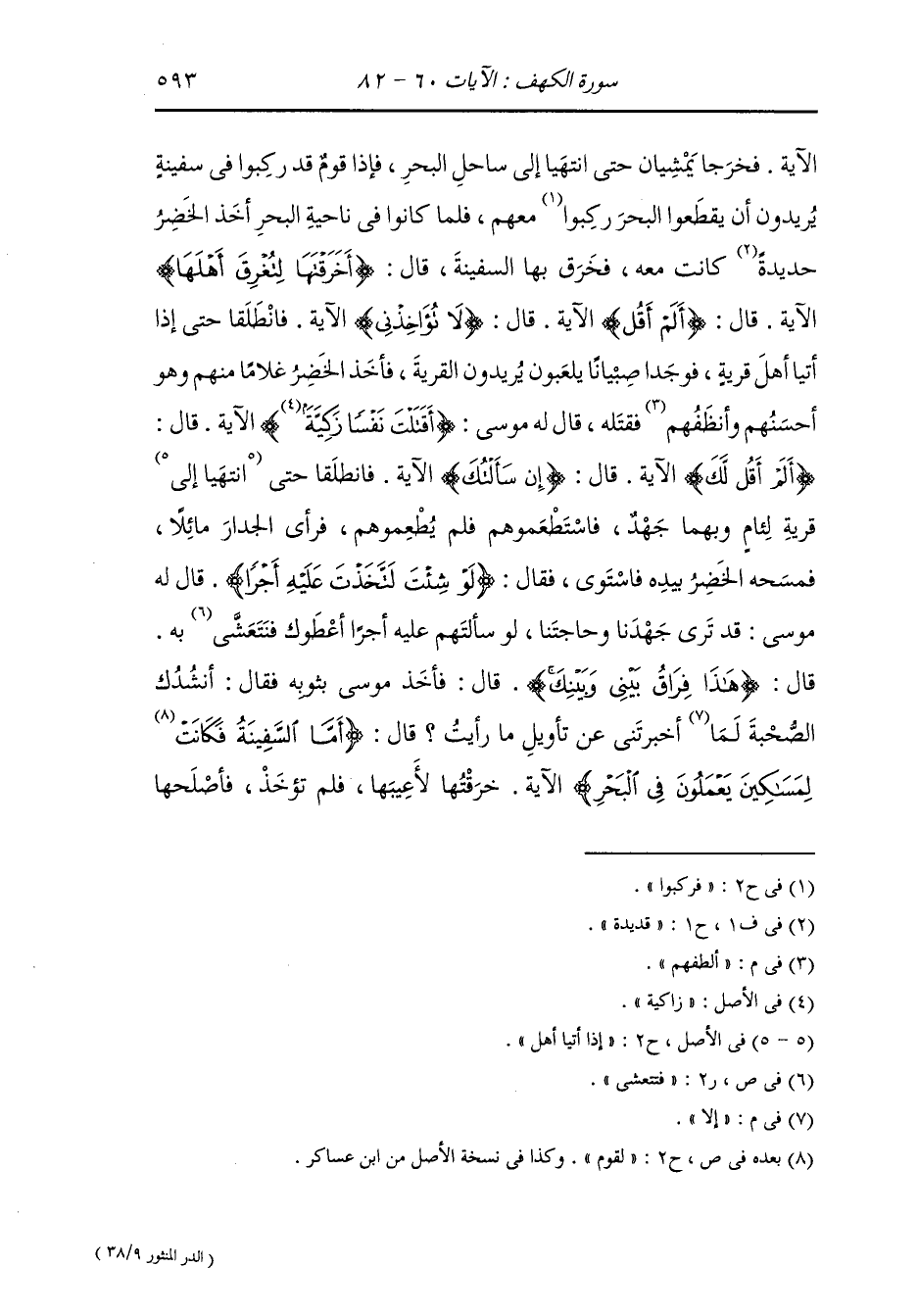 واعلم أن الآية الدالة لك على مكانه زادك الذي تزود به فأينما فقدته فهناك مكانه ، ثم خرج موسى وفتاه قد حملا حوتا مالحا في مكتل وخرجا يمشيان لا يجدان لغوبا ولا عنتا حتى انتهيا إلى العين التي كان يشرب منها الخضر فمضى موسى وجلس فتاه فشرب منها فوثب الحوت من المكتل حتى وقع في الطين ثم جرى حتى وقع في البحر ، فذلك قوله تعالى : {فاتخذ سبيله في البحر سربا} فانطلق حتى لحق موسى فلما لحقه أدركه العياء فجلس وقال لفتاه {آتنا غداءنا لقد لقينا من سفرنا هذا نصبا} قال : ففقد الحوت فقال : {فإني نسيت الحوت} الآية ، يعني فتى موسى {واتخذ سبيله في البحر عجبا قال ذلك ما كنا نبغ} إلى {قصصا} فانتهيا إلى الصخرة فأطاف بها موسى فلم ير شيئا ثم صعد فإذا على ظهرها رجل متلفف بكسائه نائم فسلم عليه موسى فرفع رأسه فقال : أنى السلام بهذا المكان ، من أنت قال : موسى بني إسرائيل ، قال : فما كان لك في قومك شغل عني قال : أني أمرت بك ، فقال الخضر : {إنك لن تستطيع معي صبرا} {قال ستجدني إن شاء الله صابرا} الآية ، {قال فإن اتبعتني فلا تسألني عن شيء حتى أحدث لك منه ذكرا}